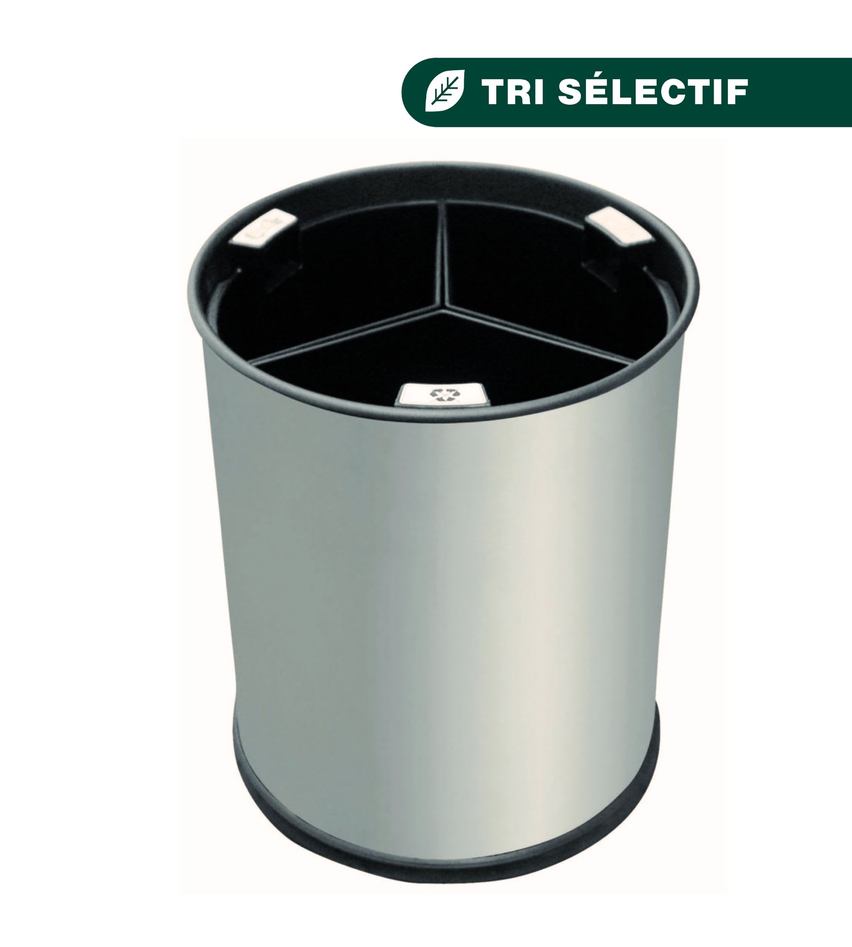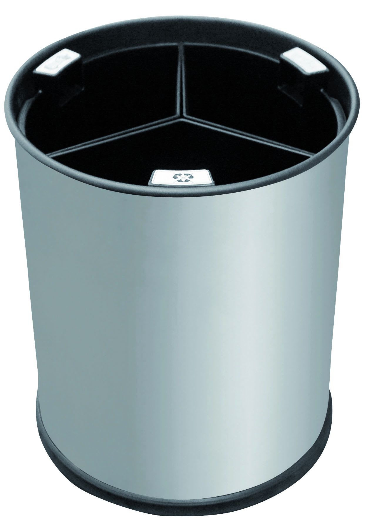 Corbeille Inox brossé d'une capacité de 13L. Cette Corbeille contient 3 bacs noirs. Poignées intégrées et amovibles. Autocollants de tri fournis.