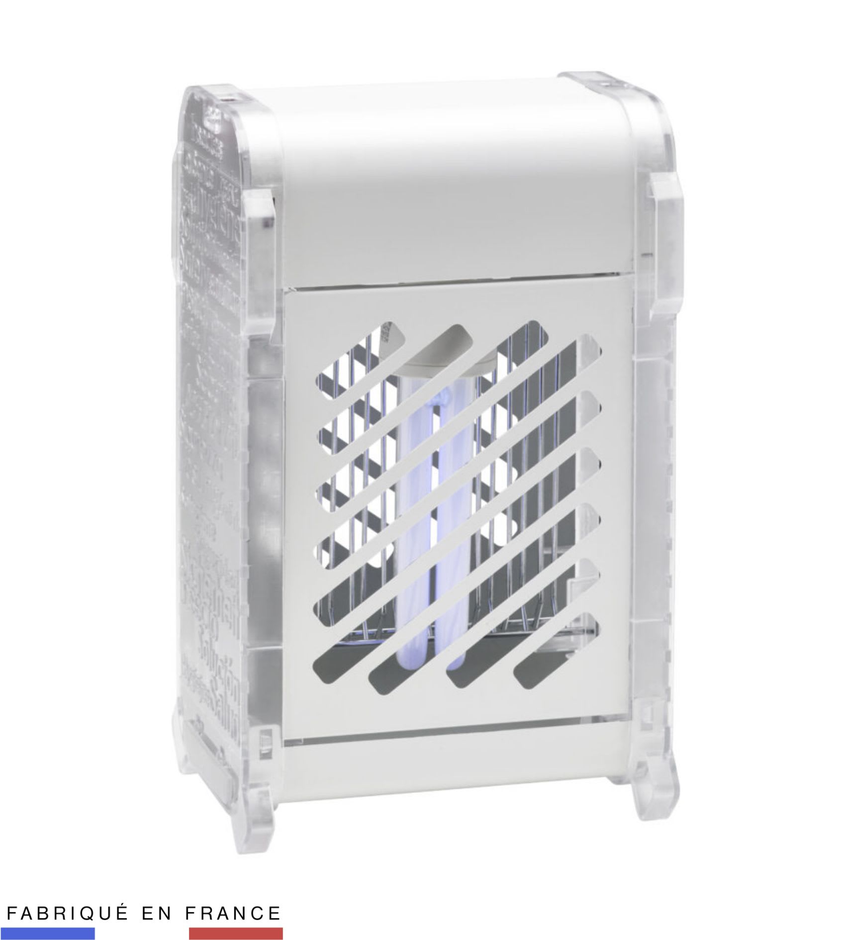 Désinsectiseur Compact blanc, acier laqué. Surface protégée autour de 60 m2, à poser, à suspendre ou à fixer au mur. Fabriqué en France et garantie 5 ans.