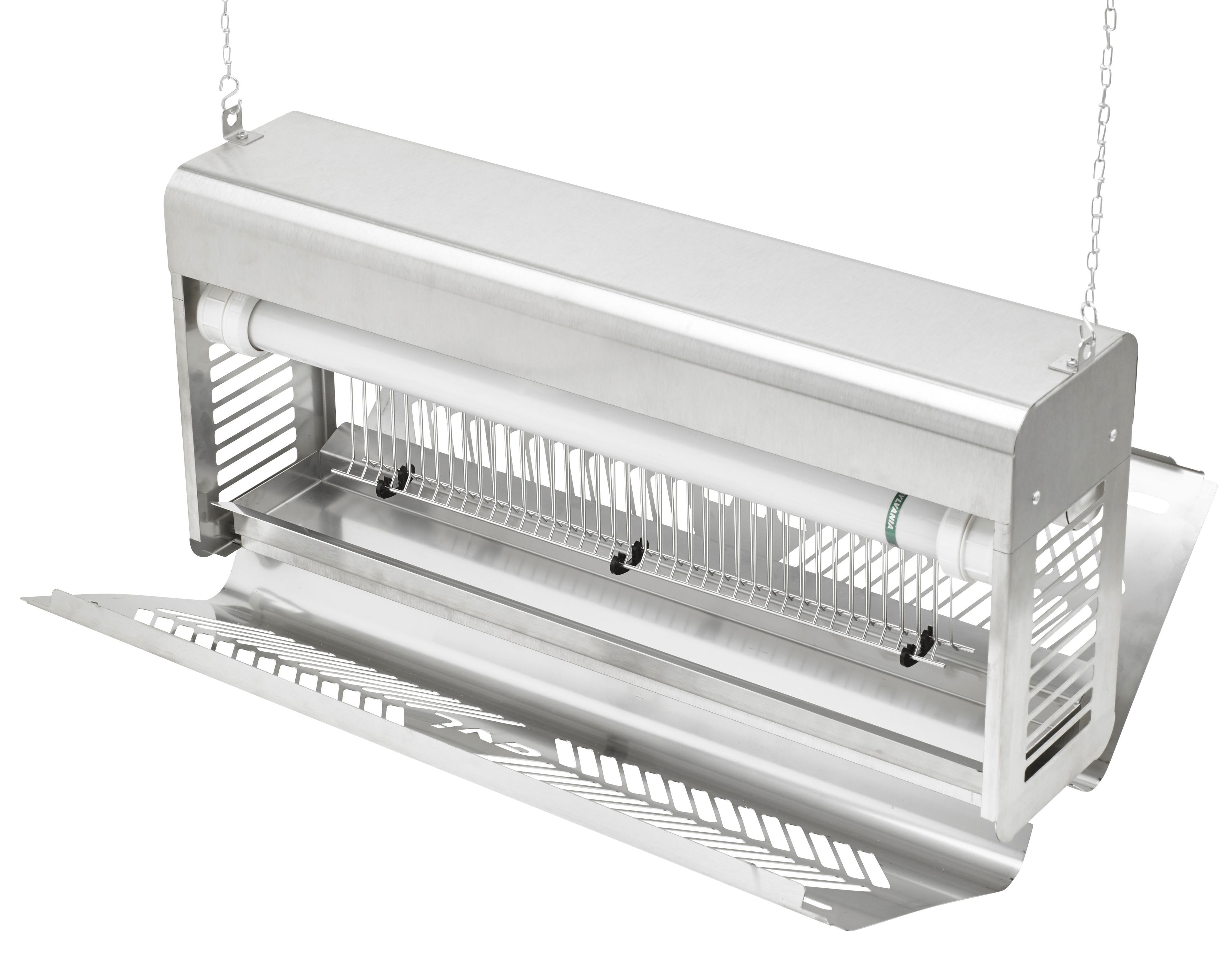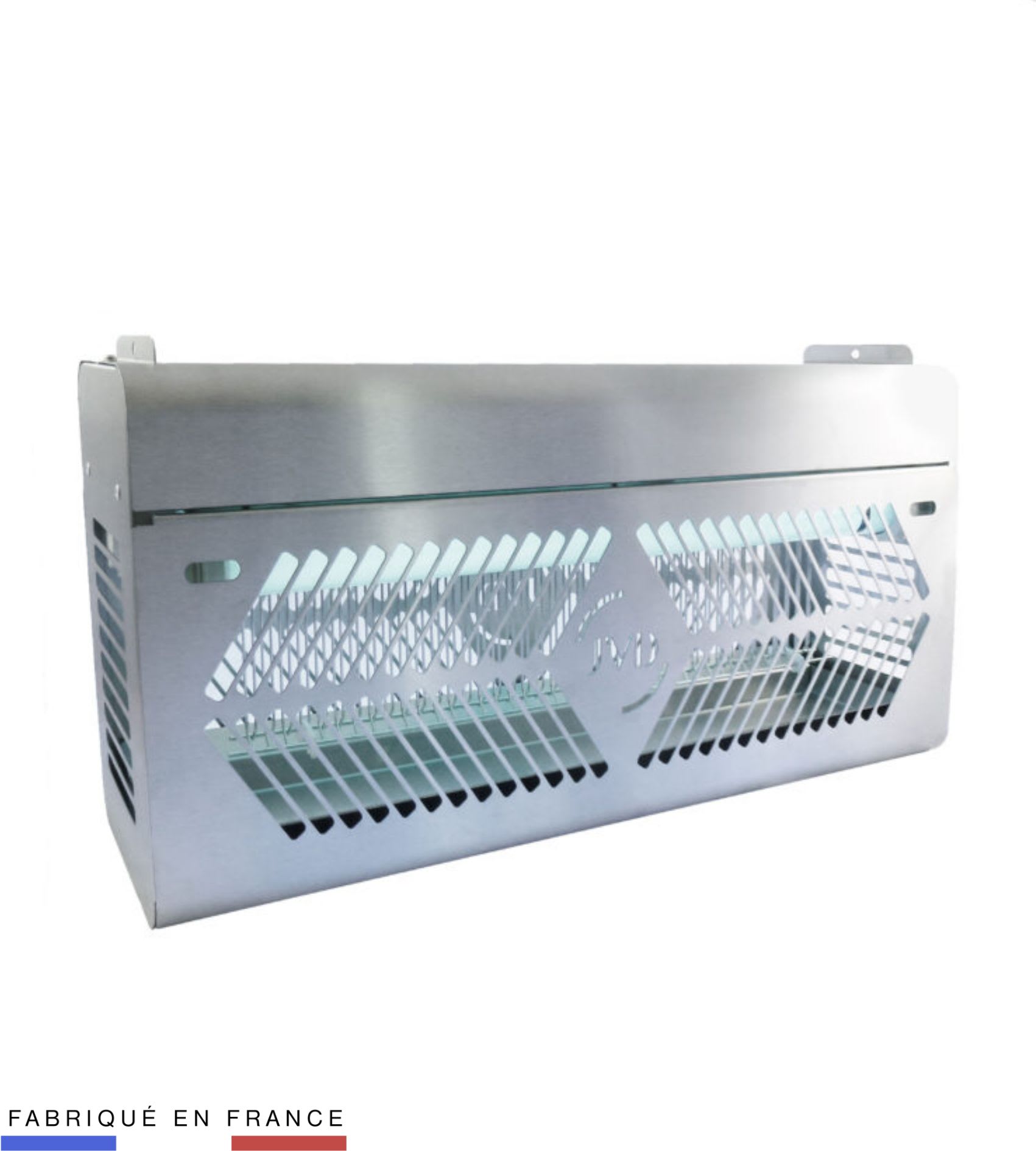 Désinsectiseur Industrie Pro 80 W TAE IP54 avec 2 tubes anti-éclats de 40 W en Inox 304L, adapté au milieu très humide. Surface protégée autour de 200 m2, à suspendre, à poser ou à fixer au mur. Fabriqué en France et garantie 5 ans.