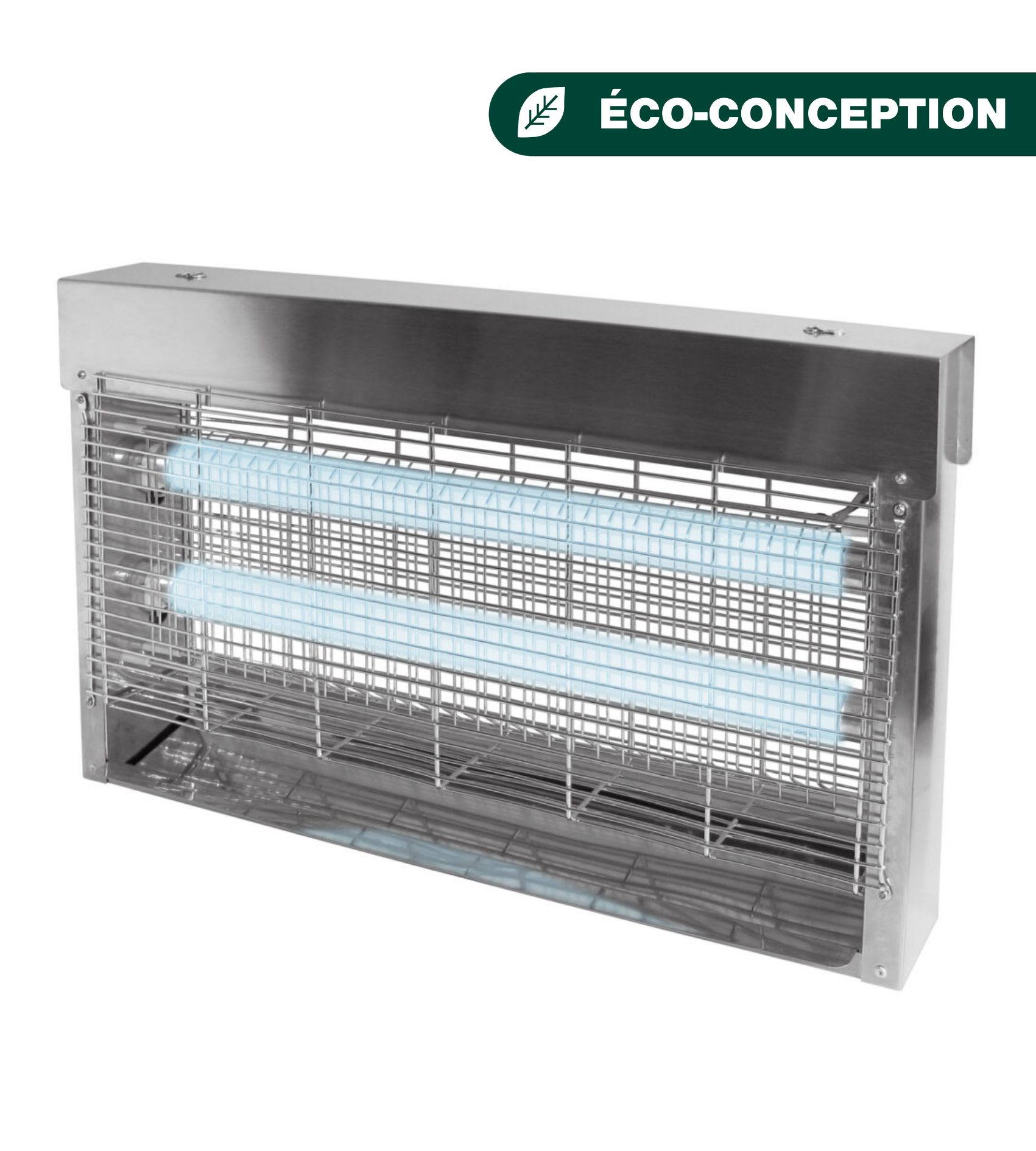 Destructeur d'insecte électrique en Inox couvrant une surface jusqu'à 80 m2, à suspendre. Technologie LED avec 2 tubes de 9W à longue durée de vie permettant d'économiser jusqu'à 50% d'énergie