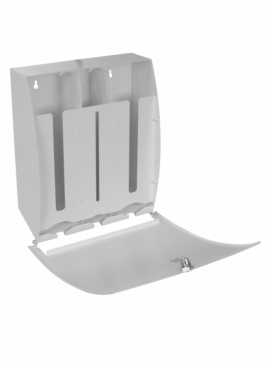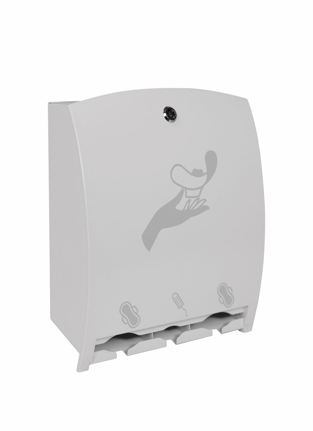 Distributeur de protections périodiques blanc en acier. 2 compartiments pour les serviettes périodiques et 1 compartiment pour les tampons. Fermeture sécurisée à clef.