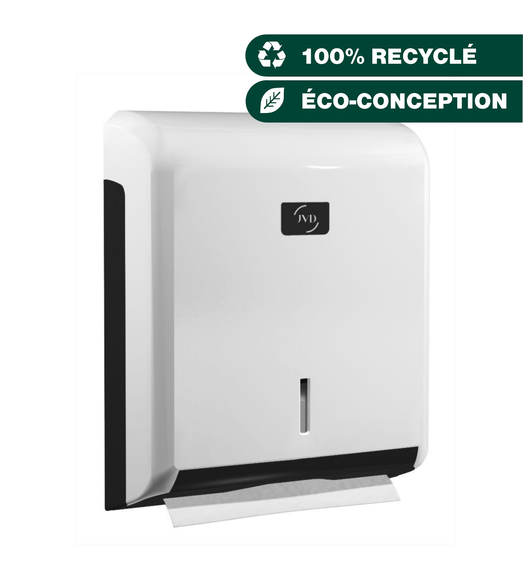 Distributeur Essuie-mains Cleanline Blanc. Capacité pour 400 à 600 feuilles (format maxi 245mm). Fait à 100% en plastique recyclé.