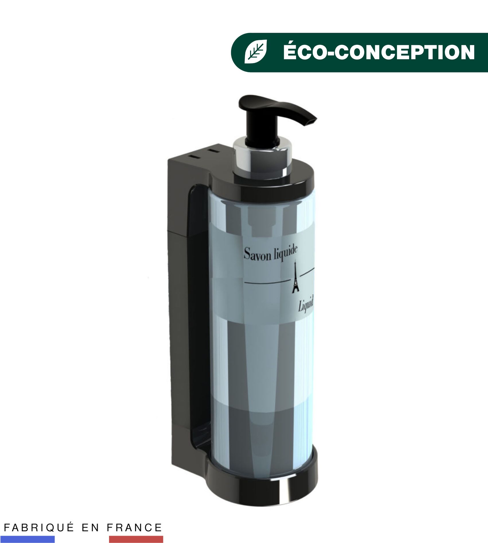 Distributeur de Savon ISISS noir 300 ml avec son réservoir verrouillé par clé. Débit de 1 ml par pression. Fait à 100% en plastique recyclé