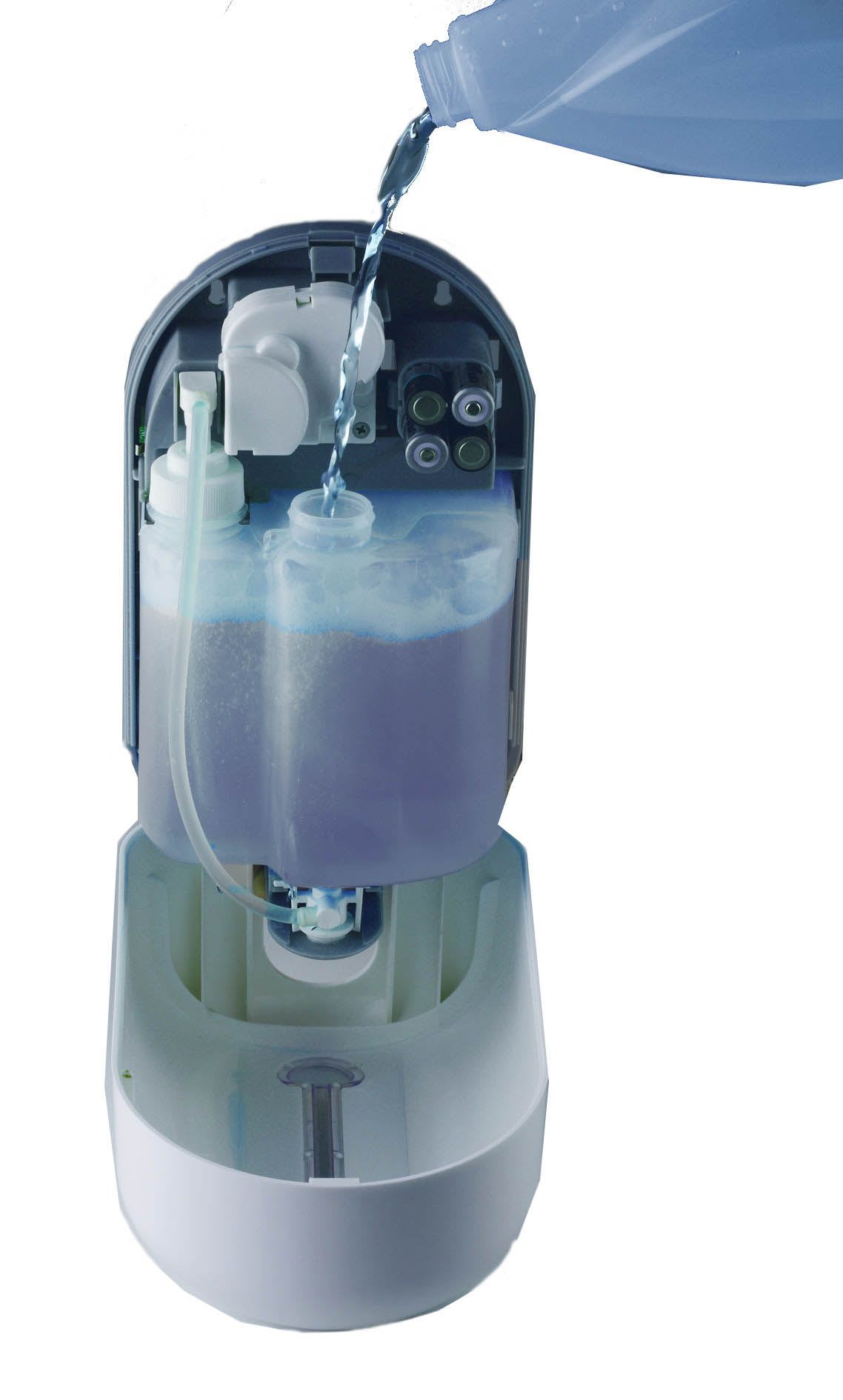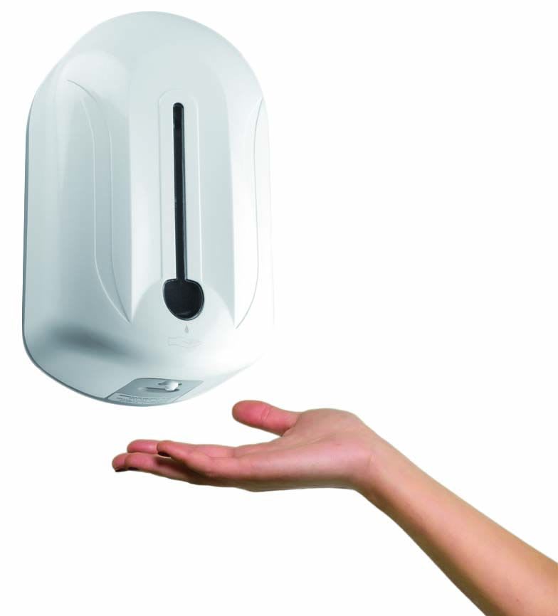 Distributeur de Savon Saphir 1100 ml avec une détection automatique des mains et un voyant de niveau translucide. Débit de 1 ml par dose. Compatible gel hydroalcoolique. 4 piles 1.5 V Type LR6 (AA) non fournies.