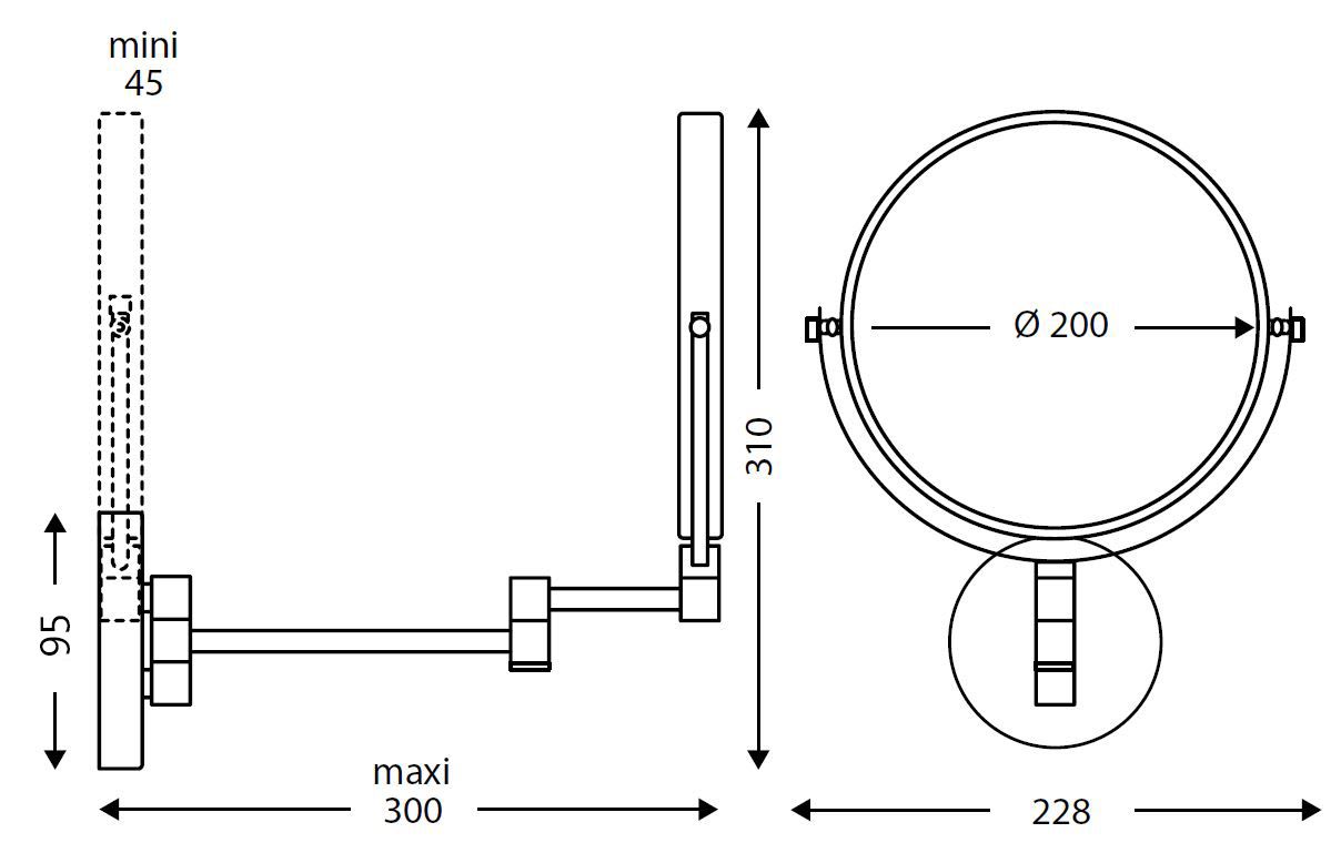 Miroir Fiesta or mural double face (normal et vision x3) avec bras en laiton chromé tubulaire.