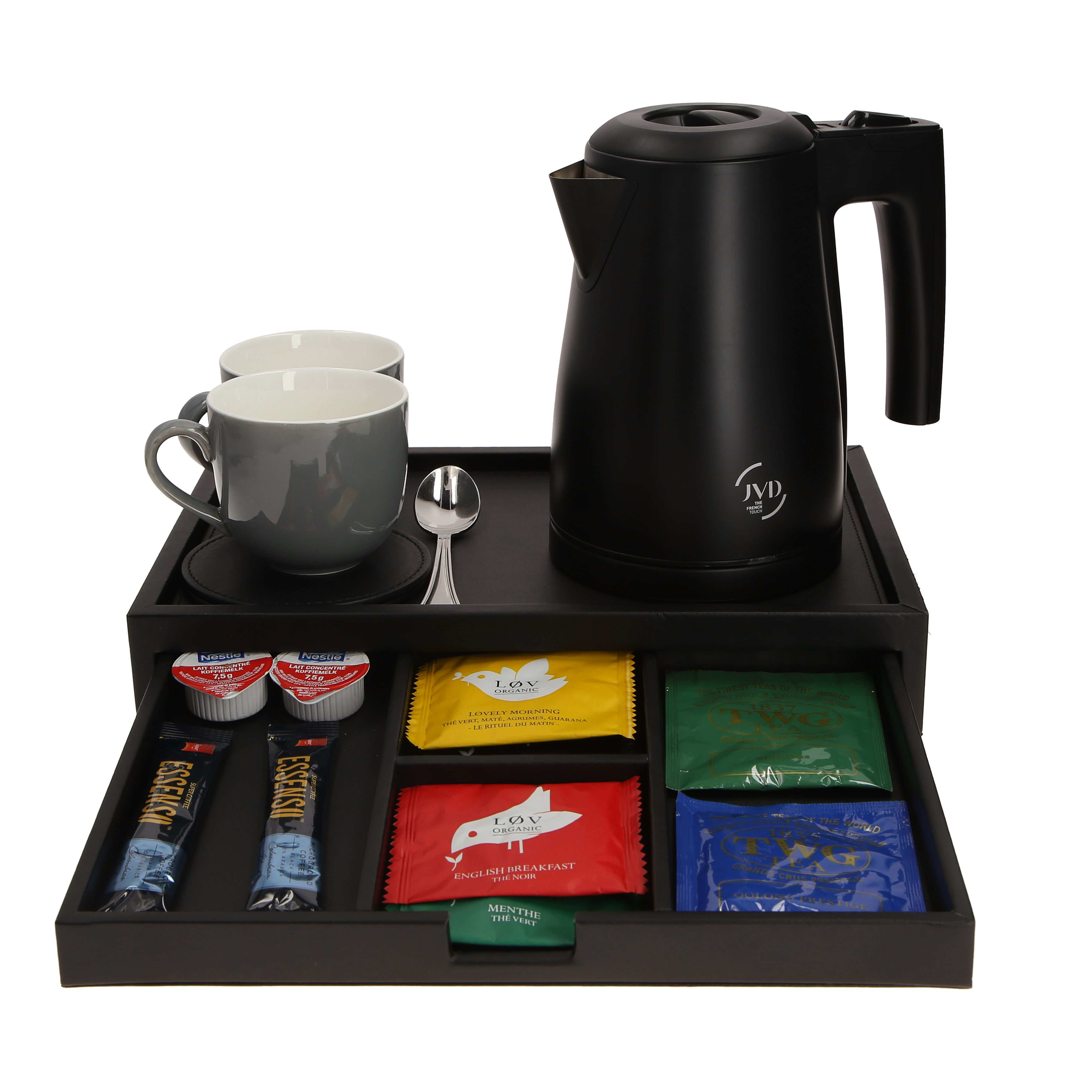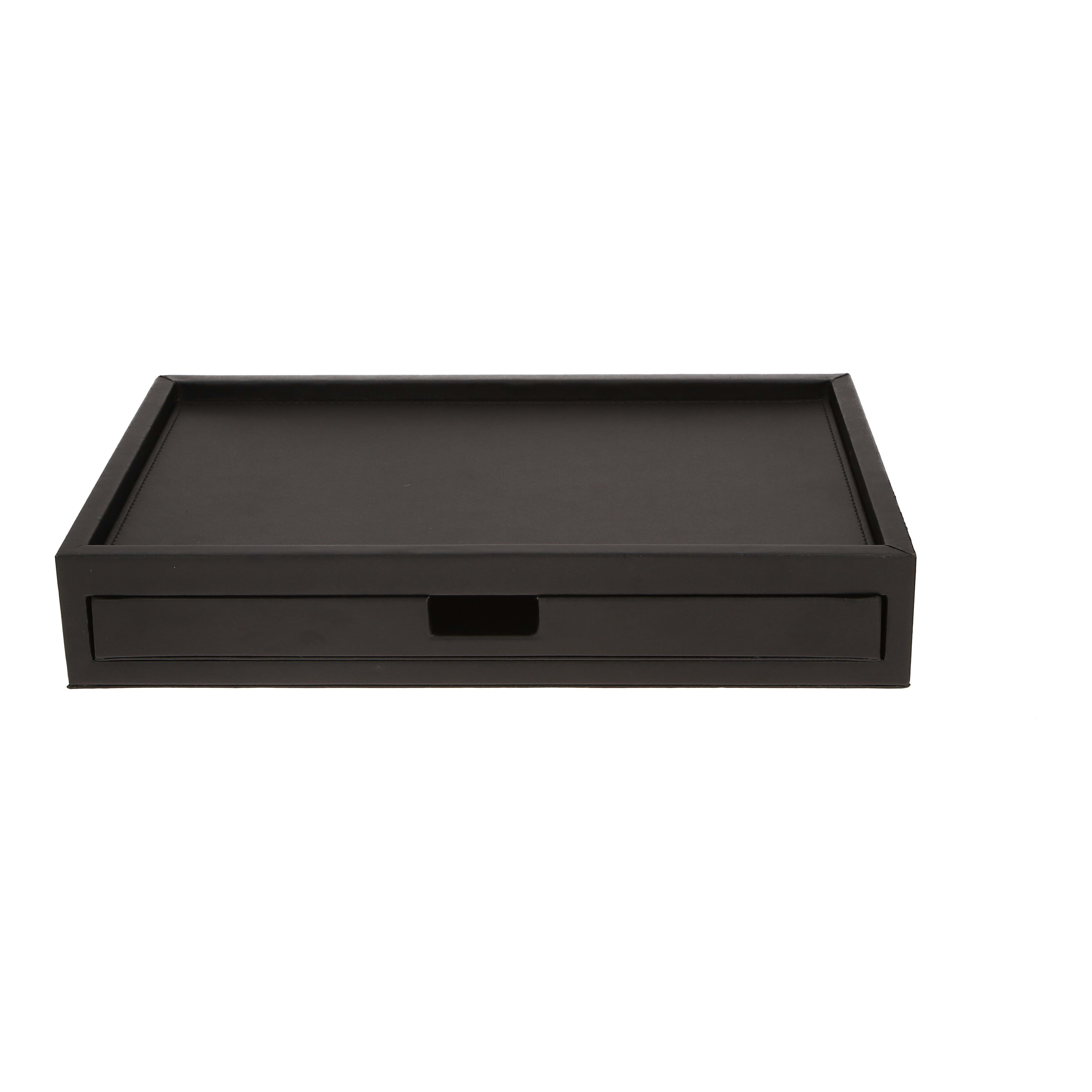 Plateau de courtoisie avec tiroir intégré finition cuir noir.