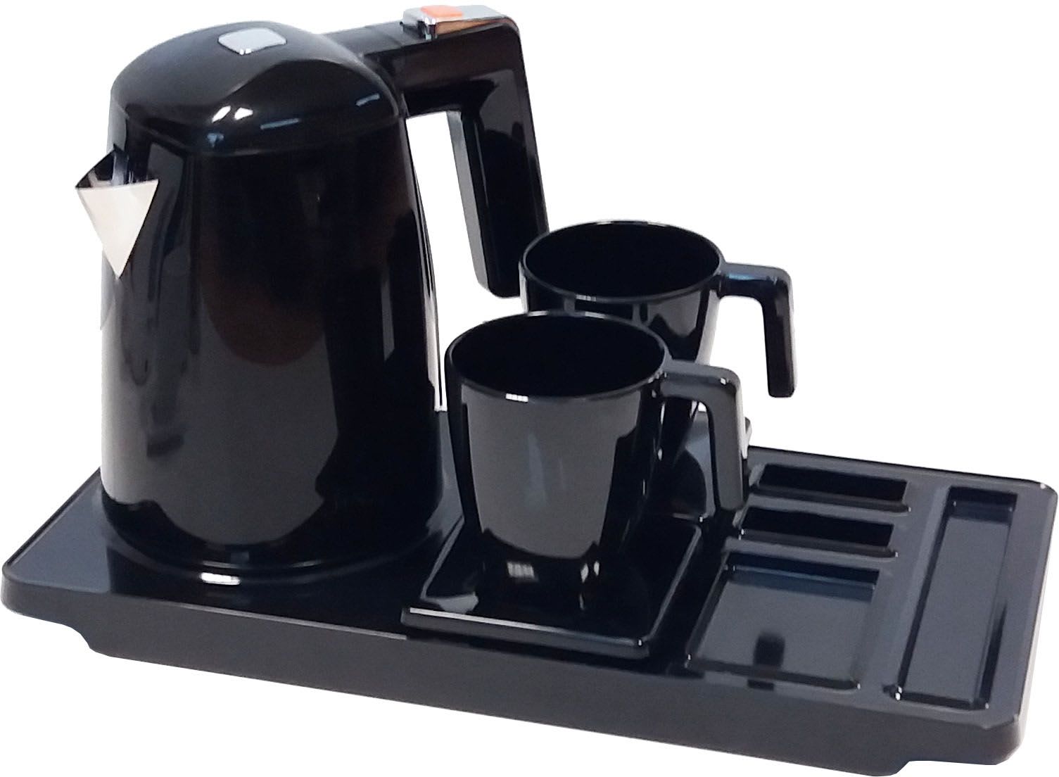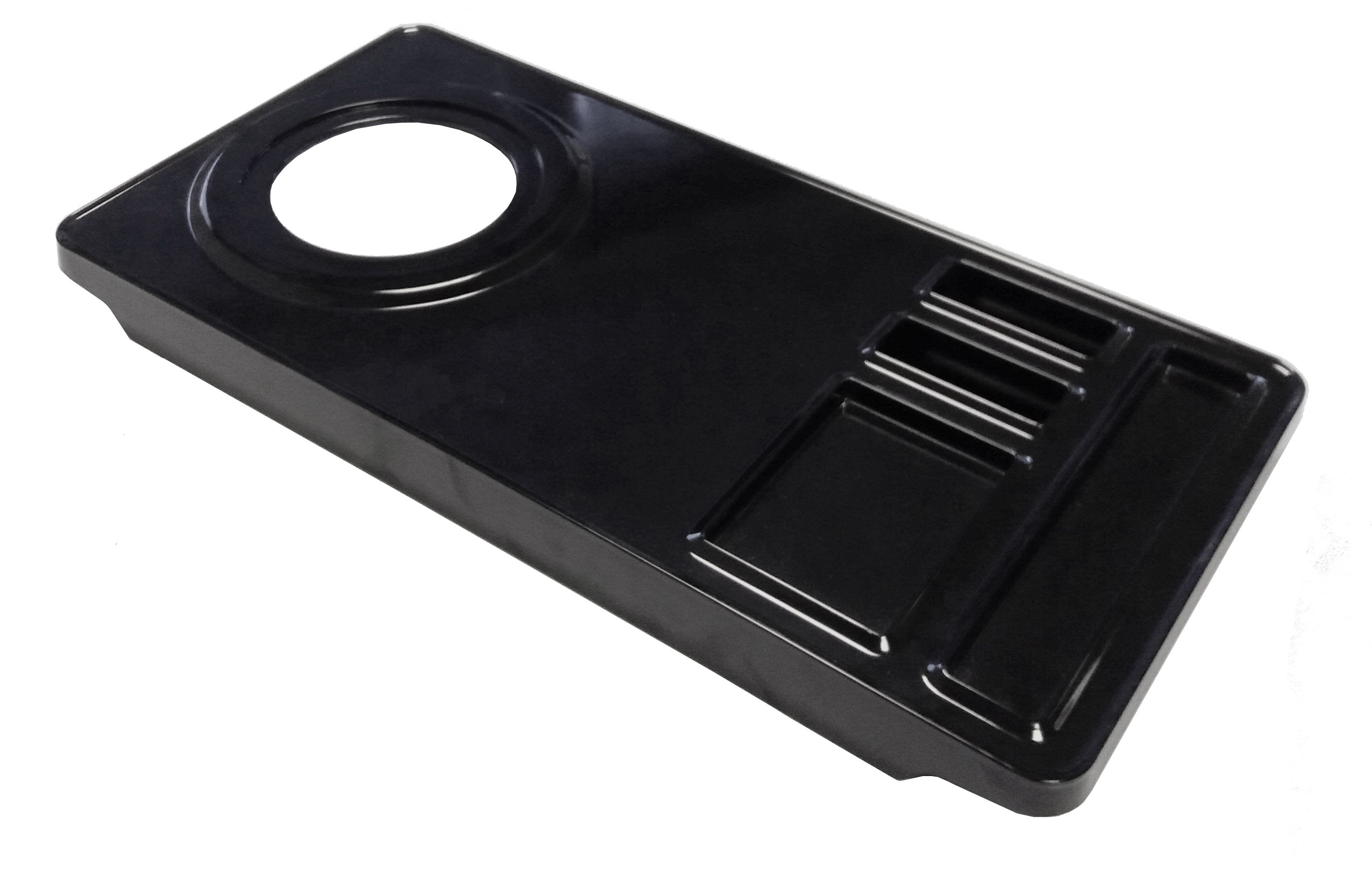Plateau Maestro noir percé avec encoches pour sachets intégrées, résistant aux brûlures et finition anti-tâche. Possibilité de fixer le support des bouilloires ZENITH et Duchesse.