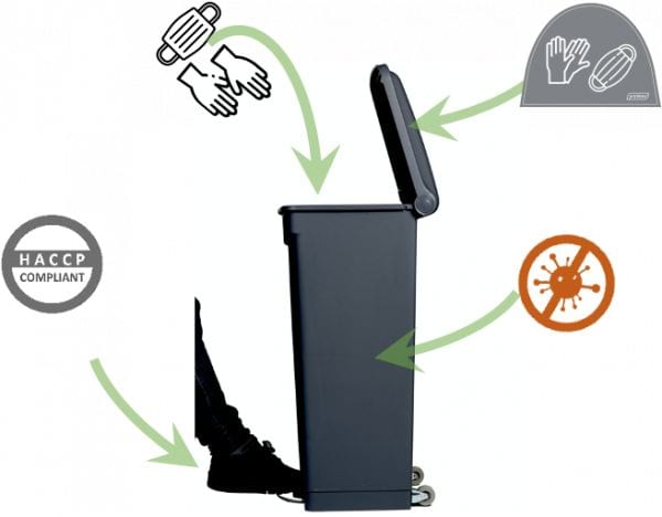 Idéal pour vos masques usagés, nos poubelles sont en matériau traité avec un agent antimicrobien et antibactérien. Dotées d'un mécanisme de pédale silencieux et robuste, elles sont sans contact. Conformes aux protocoles HACCP.