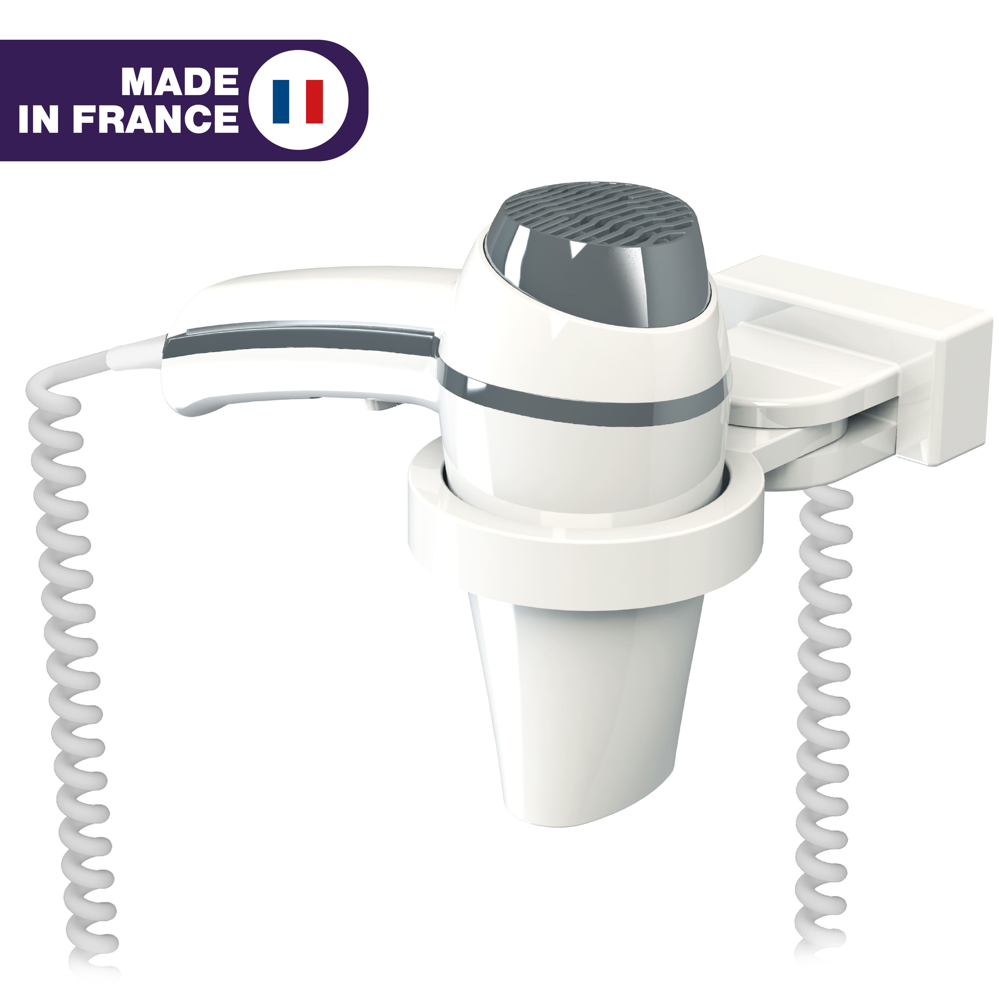 Kit Sèche-Cheveux Clipper blanc 1400 W avec Support universel précâblé pour une installation rapide, orientable à 180°. Mse en marche par simple prise en main grâce à sa poignée brevetée LighTouch. 6 configurations de séchage et équipé d'un système ionisant. Concentrateur intégré à la forme. Made in France.