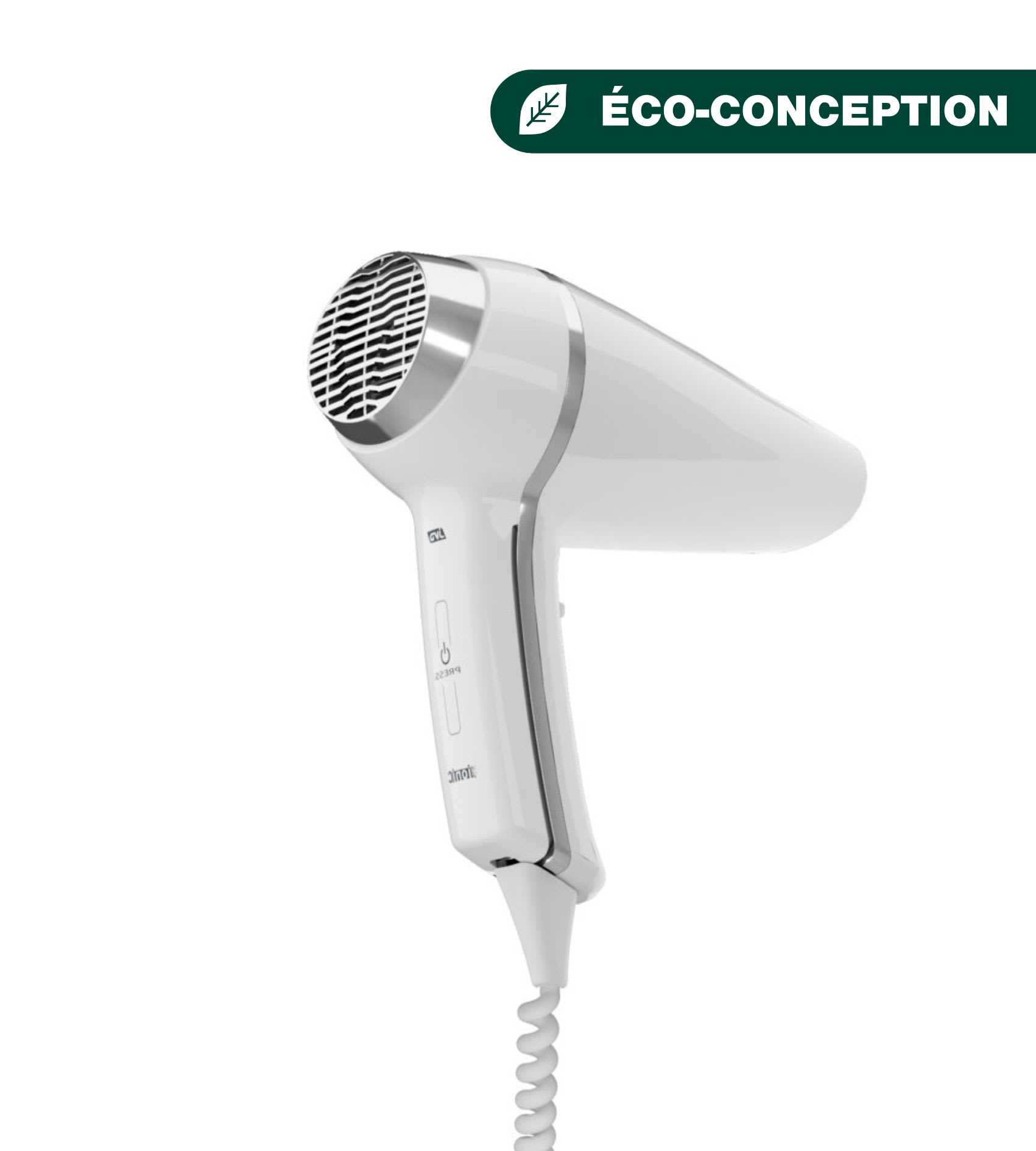 Sèche-Cheveux Clipper pistolet blanc 1400 W, mise en marche par simple prise en main grâce à sa poignée brevetée LighTouch. 6 configurations de séchage et équipé d'un système ionisant. Concentrateur intégré à la forme.