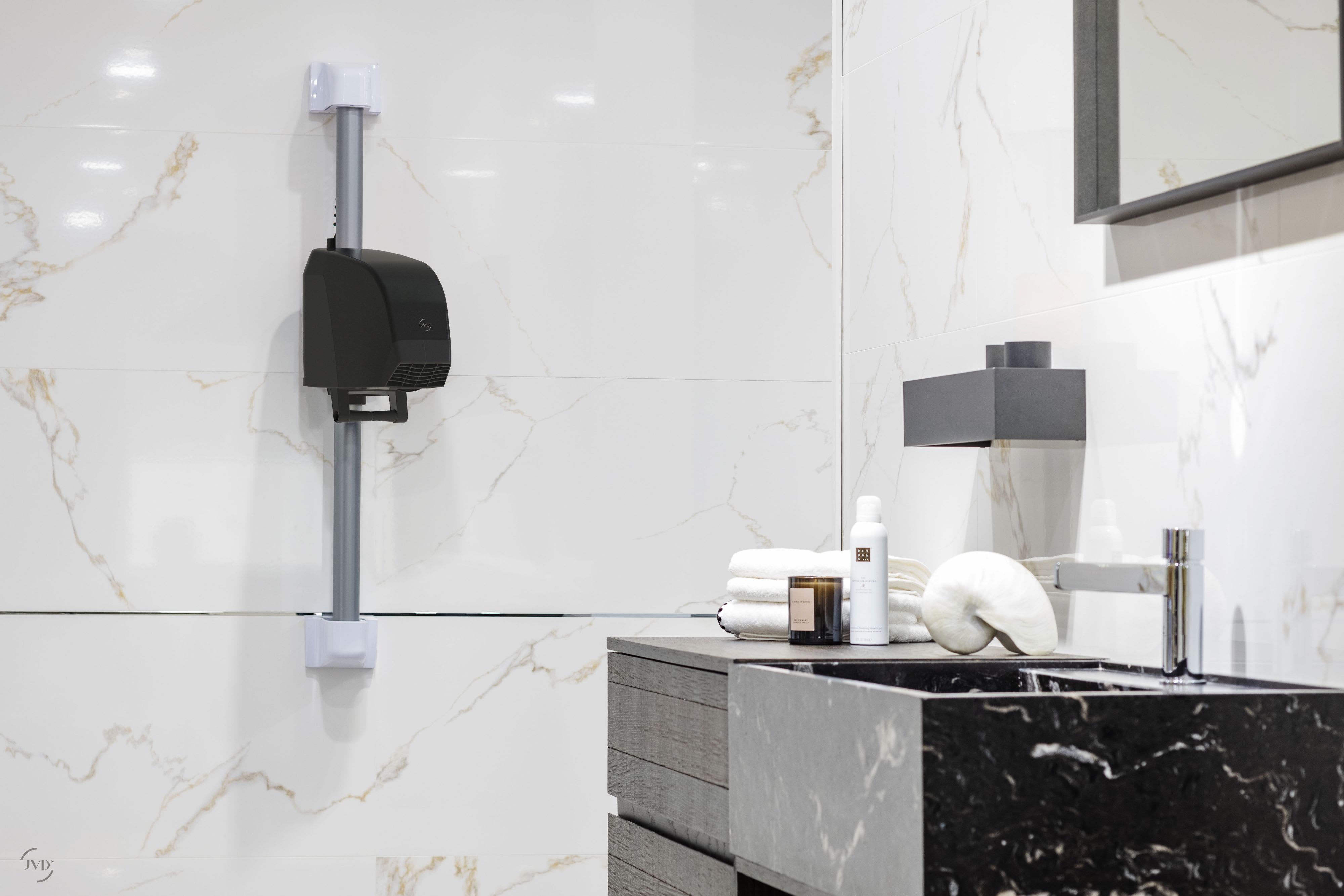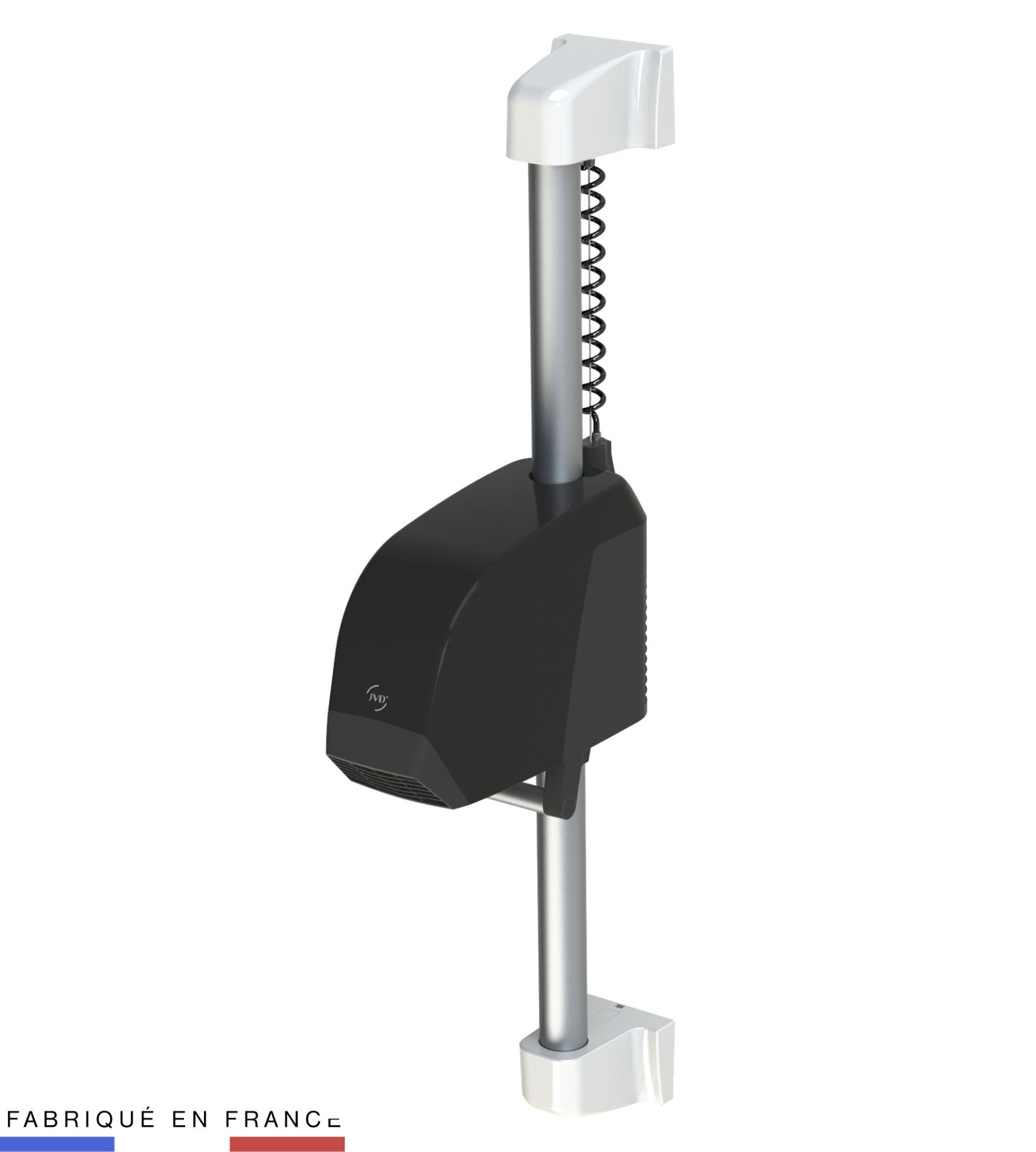 Sèche-Cheveux Neptune noir mat pour piscines et salles de sport, résistant en atmosphère chlorée et pourvu d'un moteur à induction pour une utilisation intensive. Hauteur réglable et ergonomique (rotation à 180°). Garantie 3 ans.