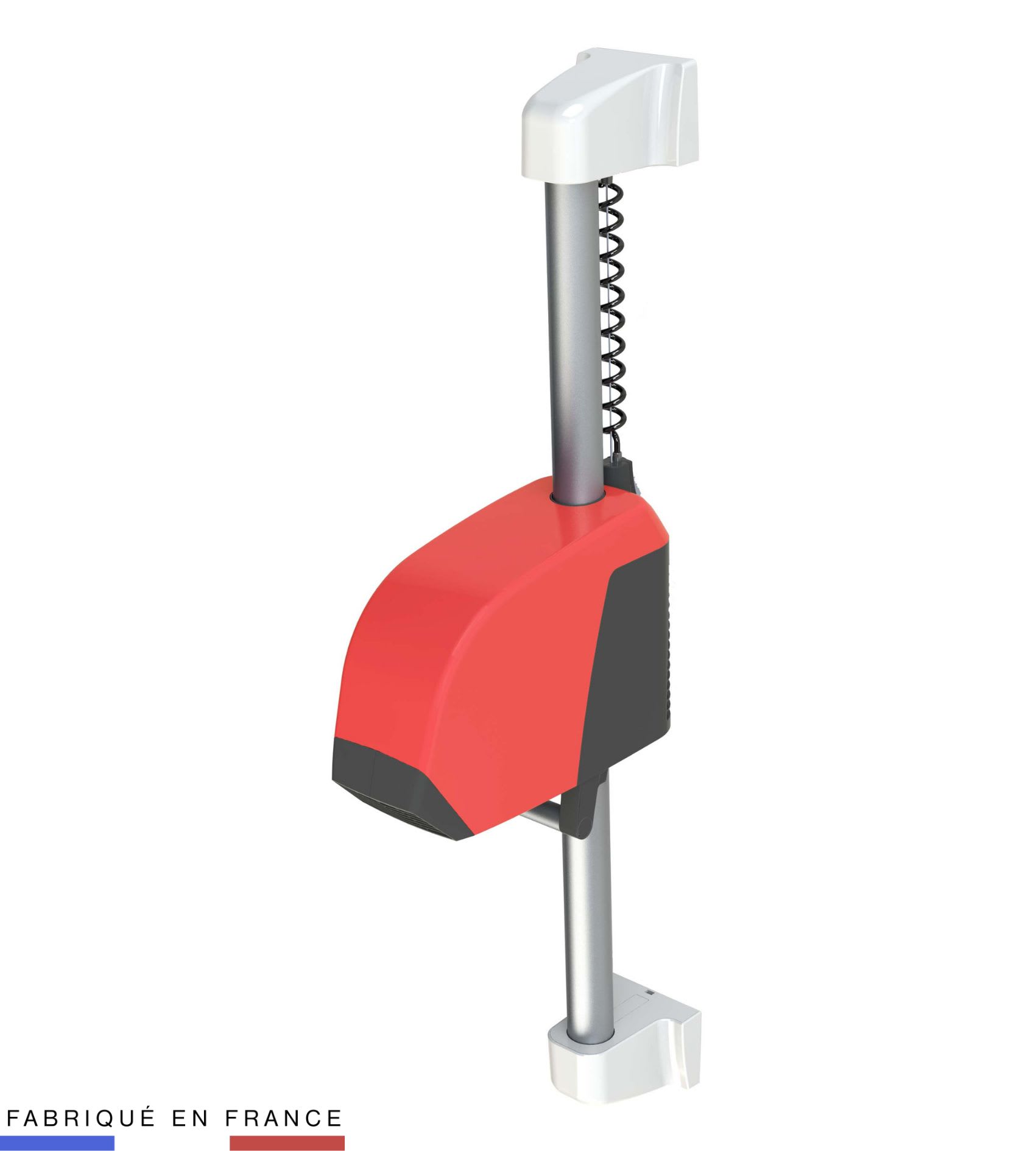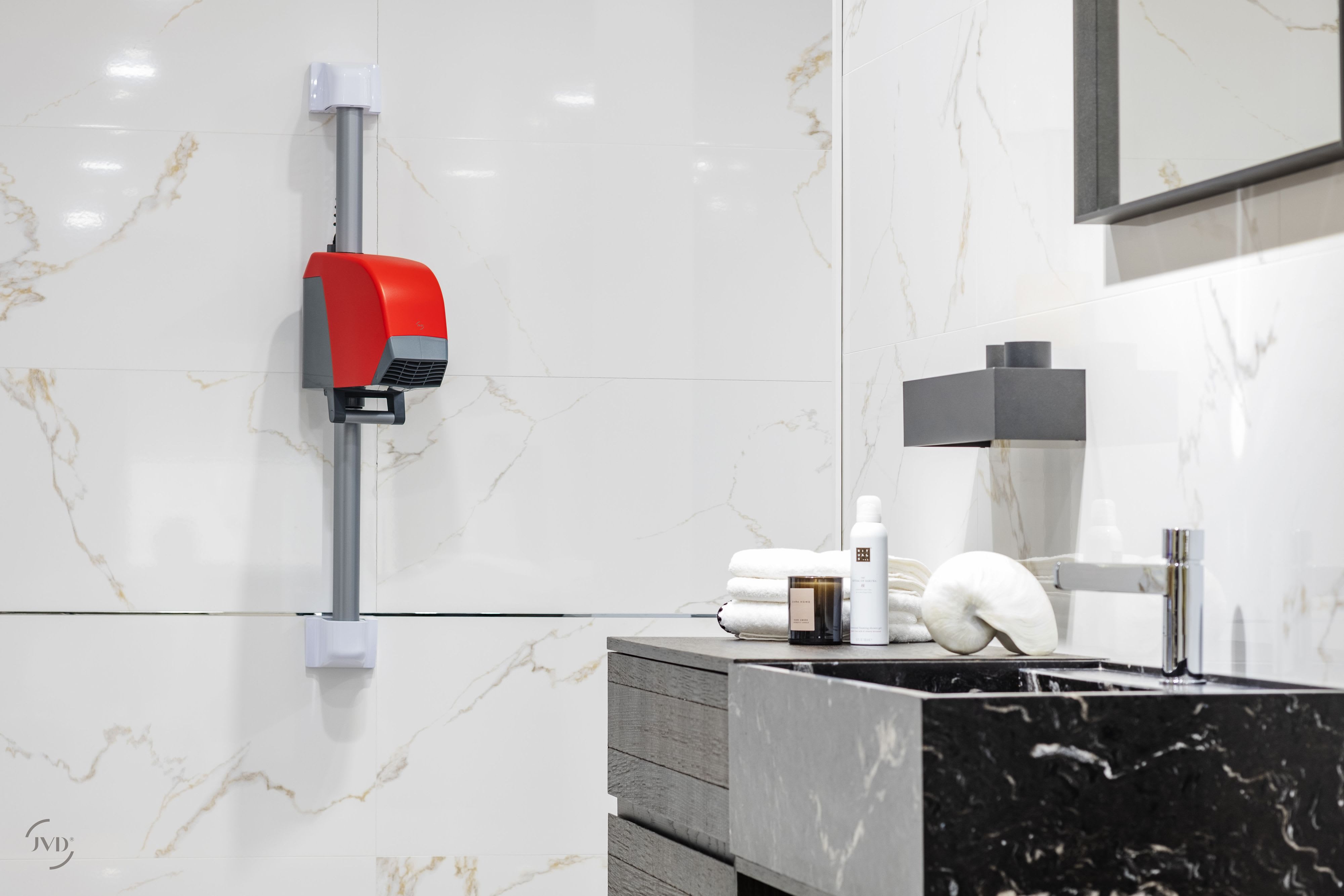 Sèche-Cheveux Neptune rouge pour piscines et salles de sport, résistant en atmosphère chlorée et pourvu d'un moteur à induction pour une utilisation intensive. S'active par détection automatique. Hauteur réglable et ergonomique (rotation à 180°). Garantie 3 ans.