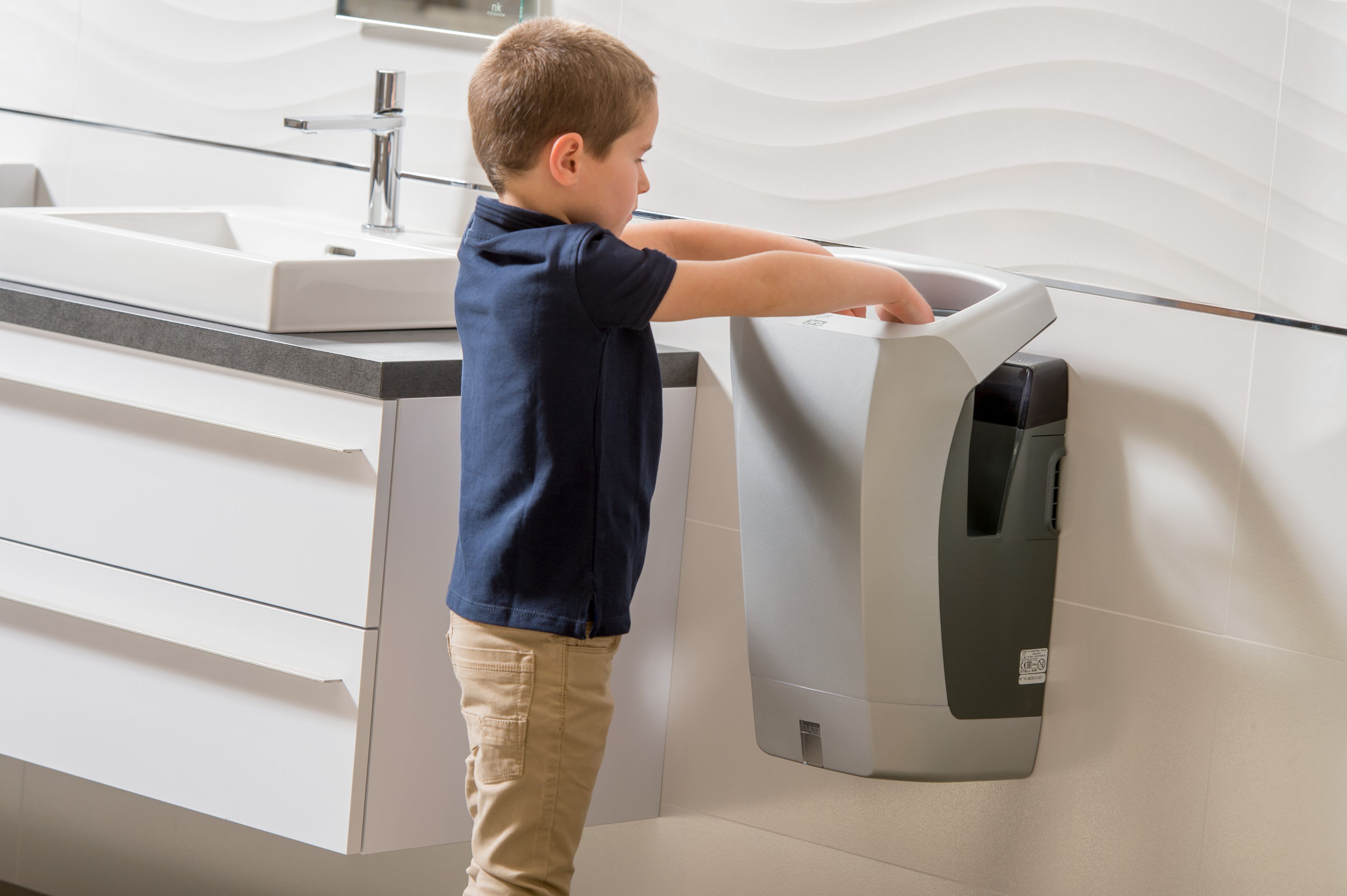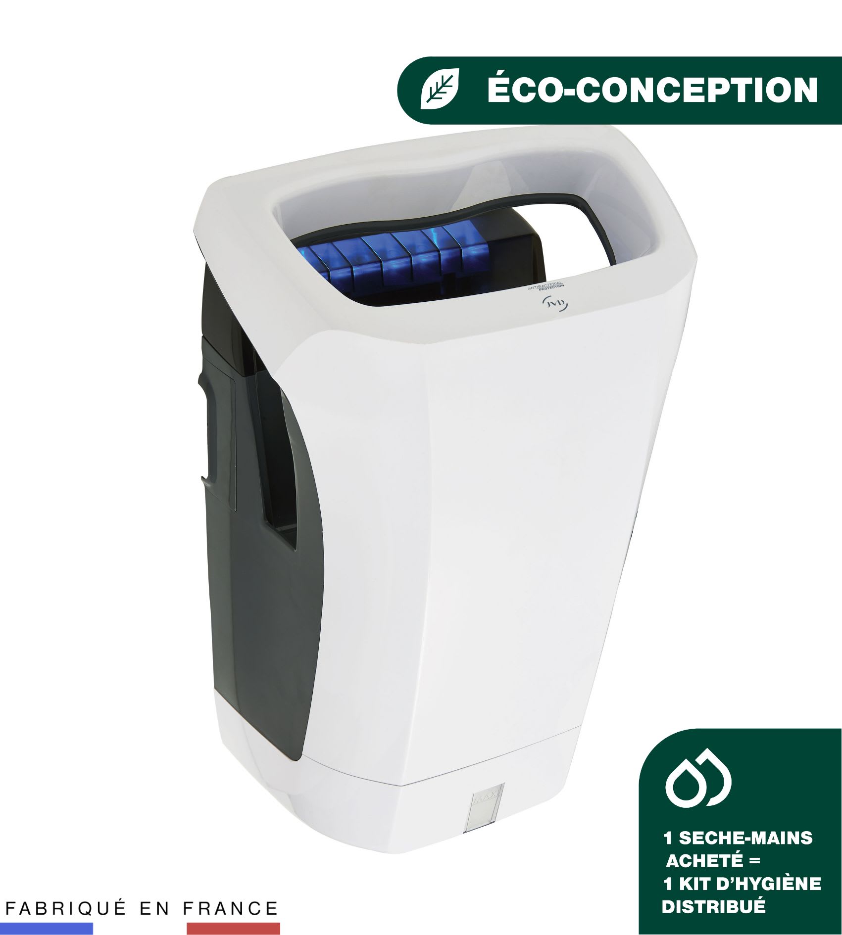 Sèche-Mains Stell'Air blanc automatique à air pulsé avec filtre cuivre bactéricide. Silencieux (73 dB) et anti-vandalisme (IK10). Doté d'un bac récupérateur d'eau ou une solution d'évacuation directe (en option). Garantie 3 ans.