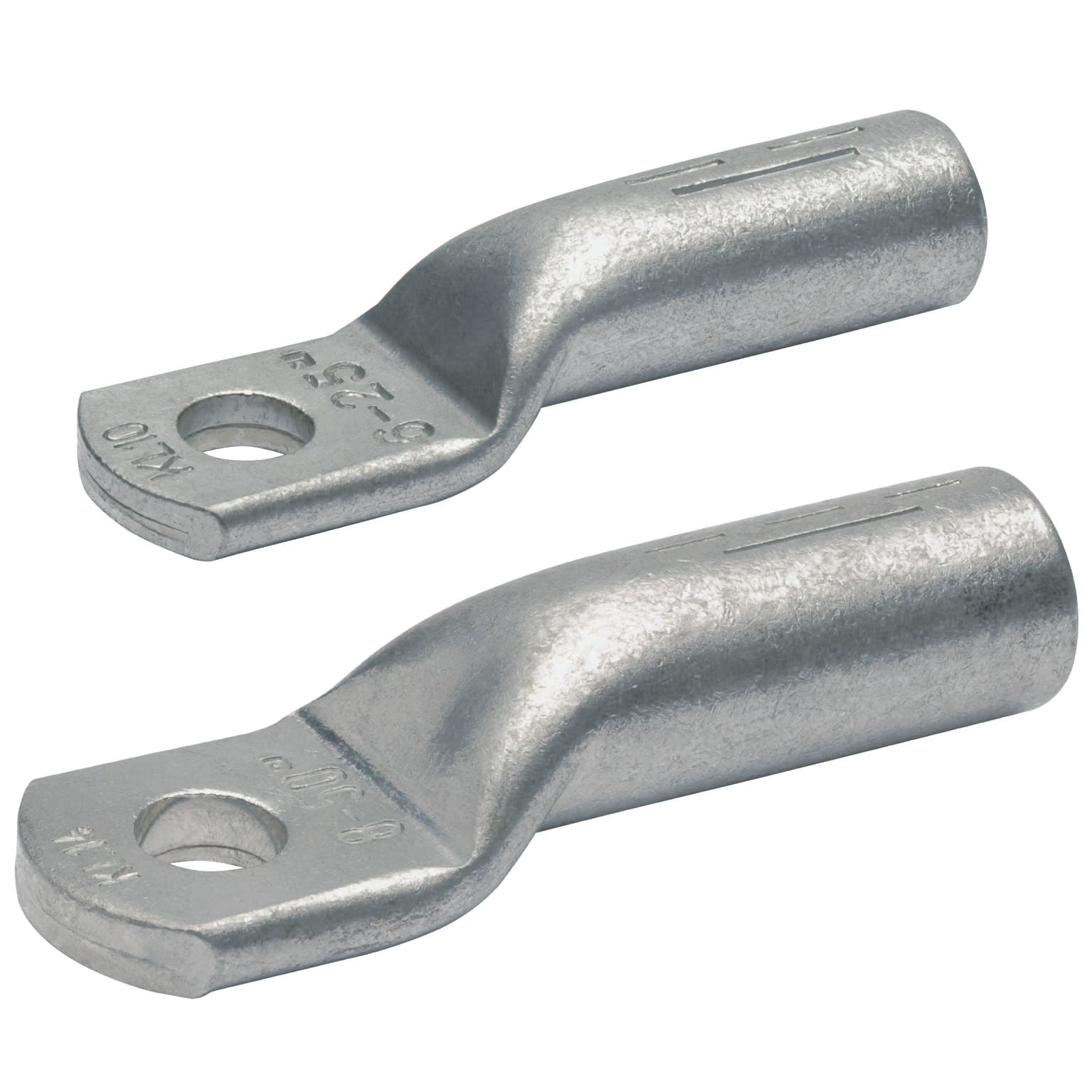 Cosse tubulaire droite en cuivre étamée par électrolyse de section 150mm² - bornage M12, sans trou d'inspection avec marquage sur le fût pour indiquer les emplacements des sertissages