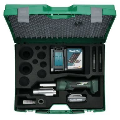 Poinçonneuse électro-hydraulique portative, force 60kN, comprenant une batterie MAKITA 18V/1,5Ah Li-Ion, un chargeur MAKITA, un axe de 19,0x105mm, un axe de 9,5x71mm et son adaptateur et une entretoise. Livré en coffret ABS