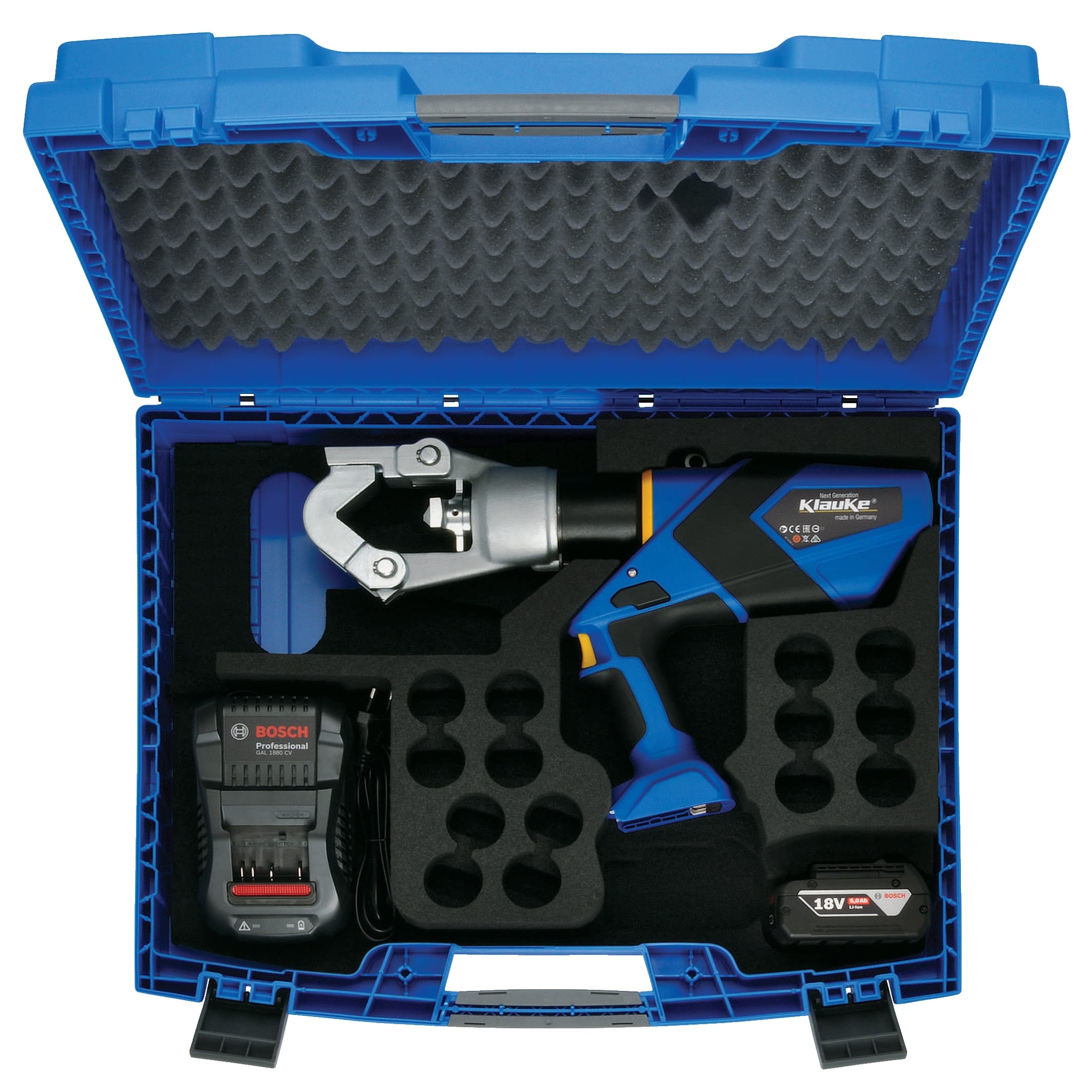 Presse électro-hydraulique 'Next Génération'. Fonctionne avec un accu Li-Ion 18V/5Ah Bosch. Convient pour le sertissage de tous types de conducteurs de 35 à 500 mm². Sertissage par poinçonnage. Tête ouvrante et pivotante. Force 108kN