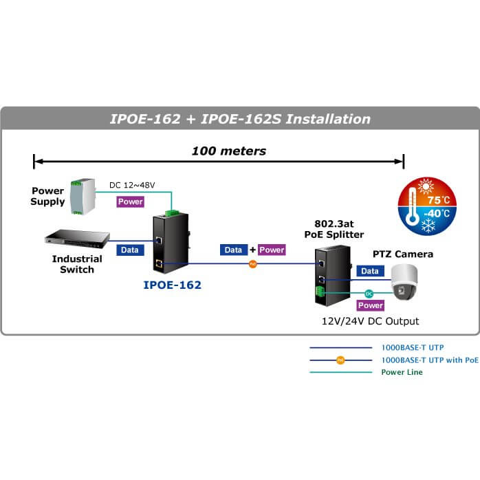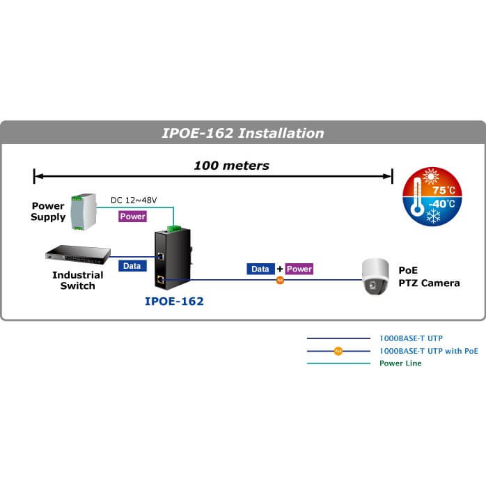PlanetInjecteur PoE Gigabit industriel IEEE 802.3at 30W (IP30) -40/+75°C