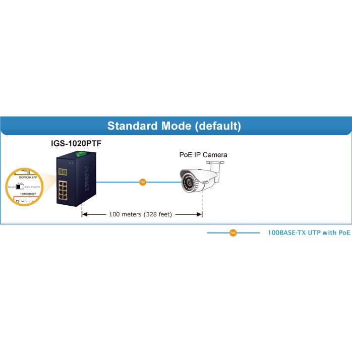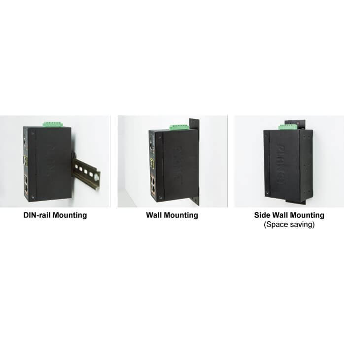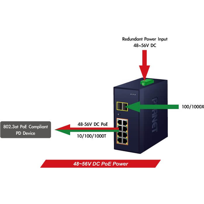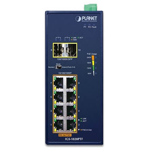 PlanetSwitch RAIL DIN non administrable, 8 ports PoE+ (802.3at), budget total de 240W, et 2 ports SFP. Conçu pour des environnements industriels avec gestion avancée. Température de -40°C à 75°C. Alimentation non incluse (voir accessoires).