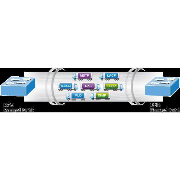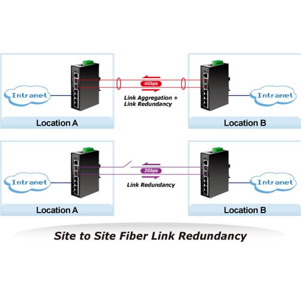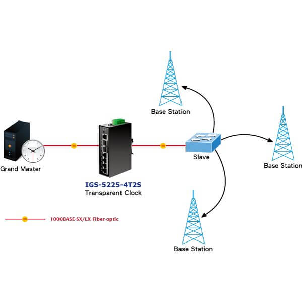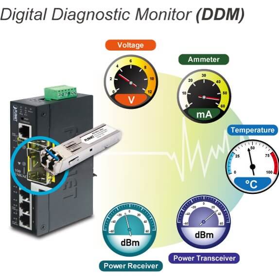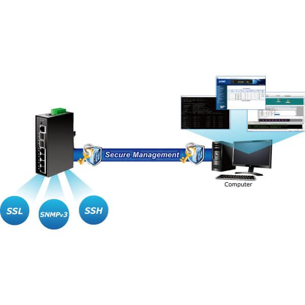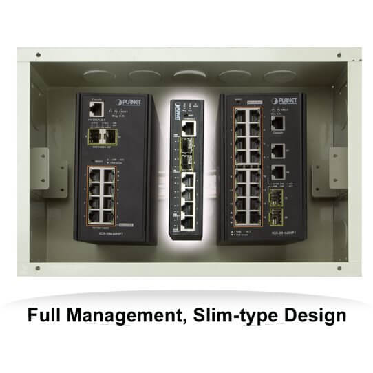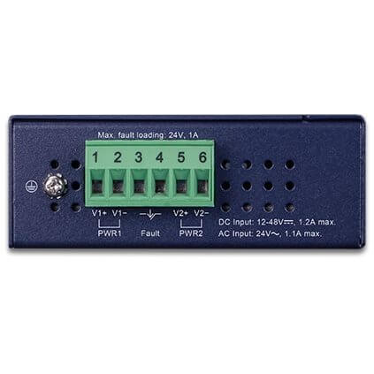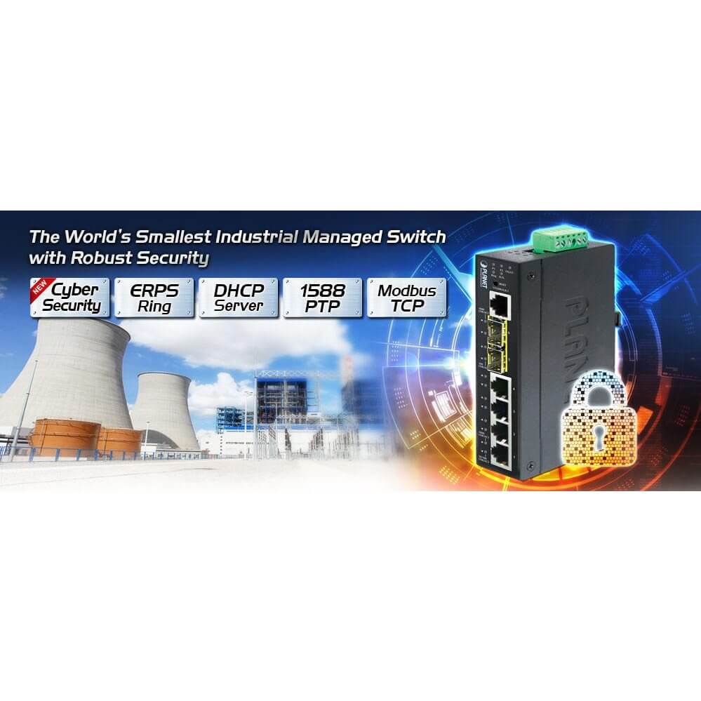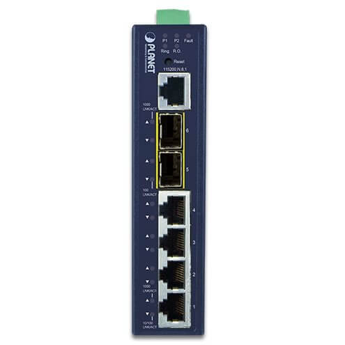 PlanetSwitch RAIL DIN administrable L2+, 4 ports RJ45 Gigabit et 2 ports SFP. Conçu pour des environnements industriels avec gestion VLAN avancée et protection ESD. Température -40°C à 75°C. Alimentation non incluse (voir accessoires).