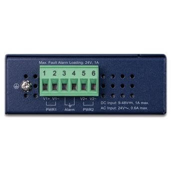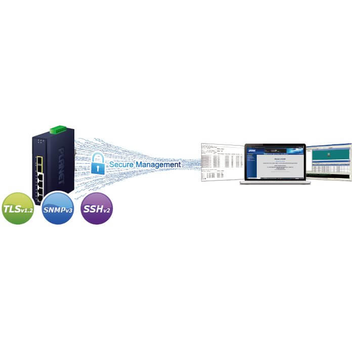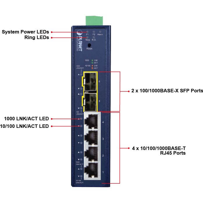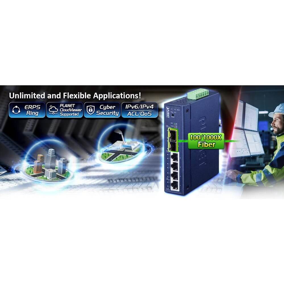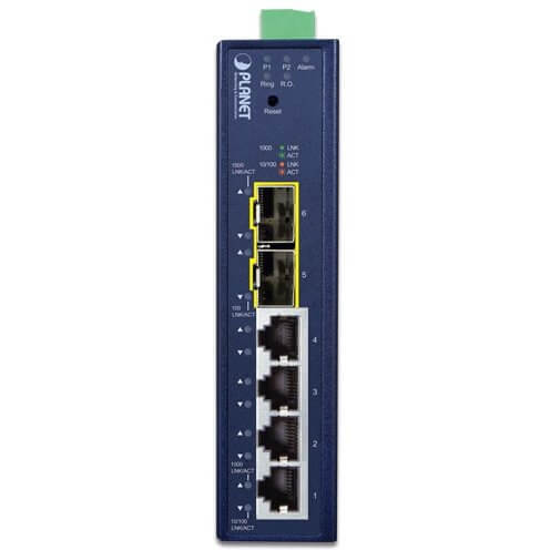 PlanetSwitch RAIL DIN administrable avec 4 ports Gigabit RJ45 et 2 SFP. Température de fonctionnement -40°C à 75°C. Alimentation non incluse (voir accessoires).