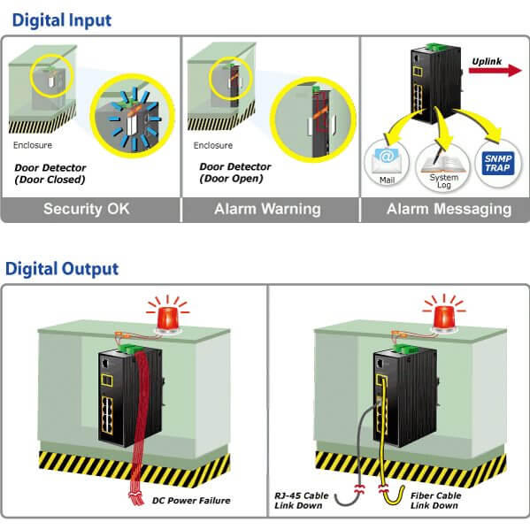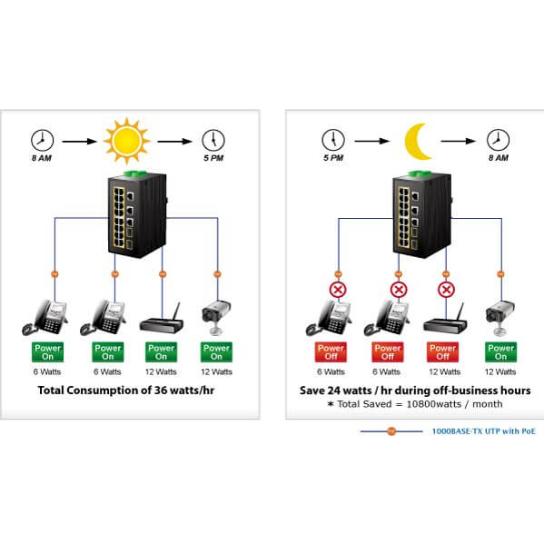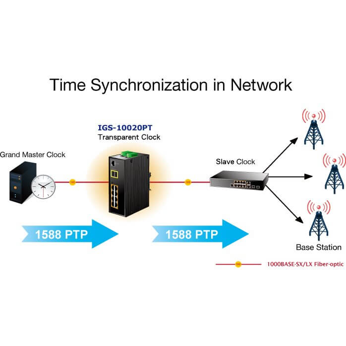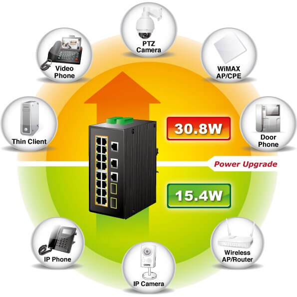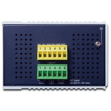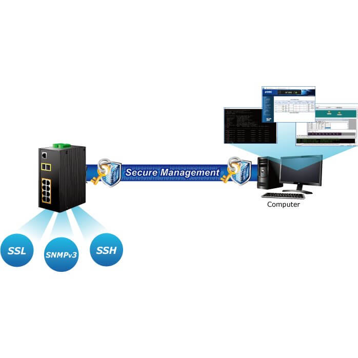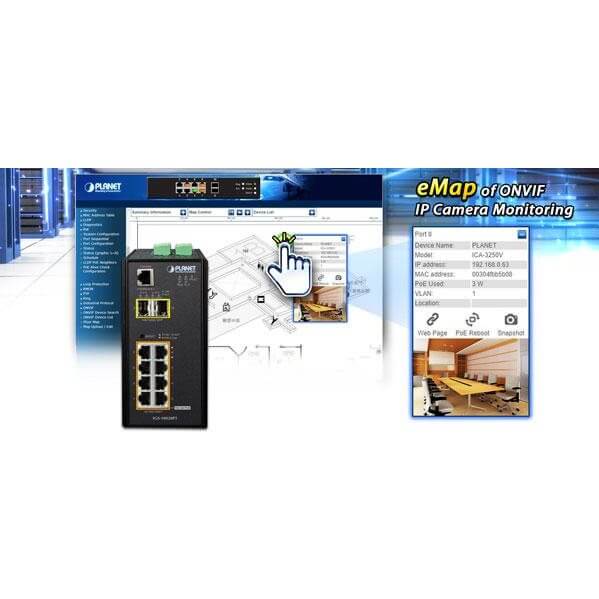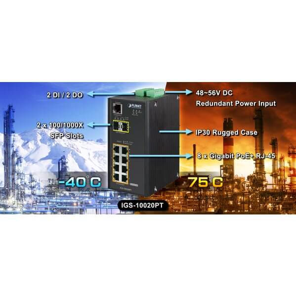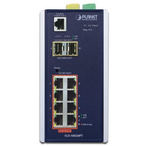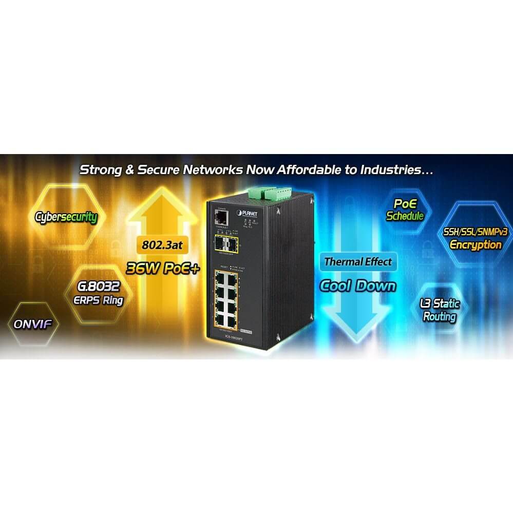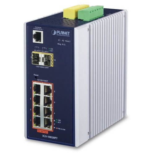 PlanetSwitch RAIL DIN administrable L2+, 8 ports PoE (802.3af), budget 240W, et 2 ports SFP. Gestion avancée et support SNMP/Modbus TCP. Température de fonctionnement de -40°C à 75°C. Alimentation non incluse (voir accessoires).