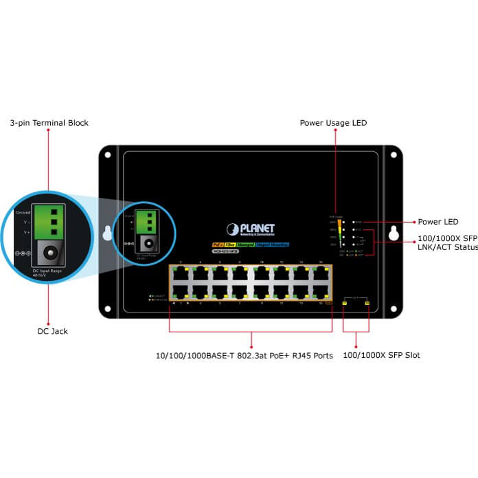 PlanetSwitch Ethernet PoE industriel (Mural) 16 Ports 10/100/1000T PoE at + 2 ports SFP Giga administrable L2+/L2 Ring avec large température de fonctionnement (IP30) -40/+75°C
