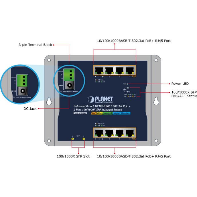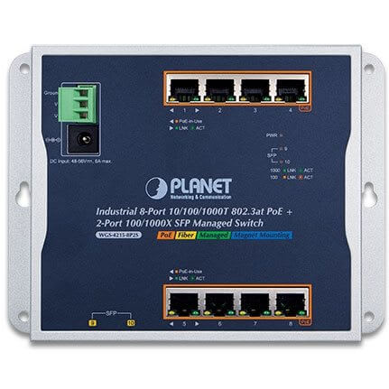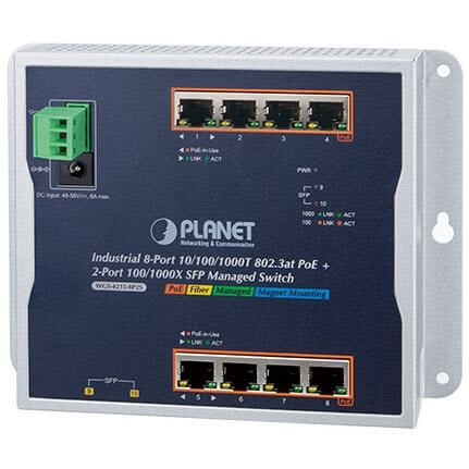 PlanetSwitch Ethernet PoE industriel (Mural) 8 Ports 10/100/1000T PoE at + 2 ports SFP Giga administrable L2+/L2 Ring avec large température de fonctionnement (IP30) -40/+75°C