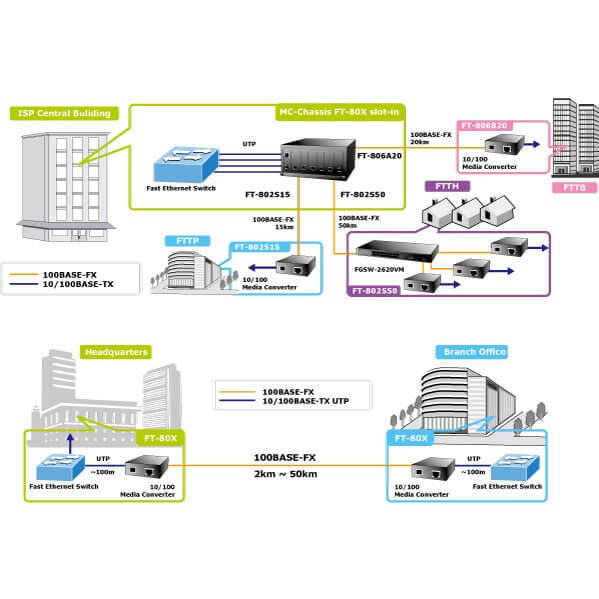Ce convertisseur Fast Ethernet 10/100Base-TX vers Fibre 100Base-FX SC permet de convertir le signal d'un cable ethernet en paires torsadées vers un cable ethernet en fibre optique.