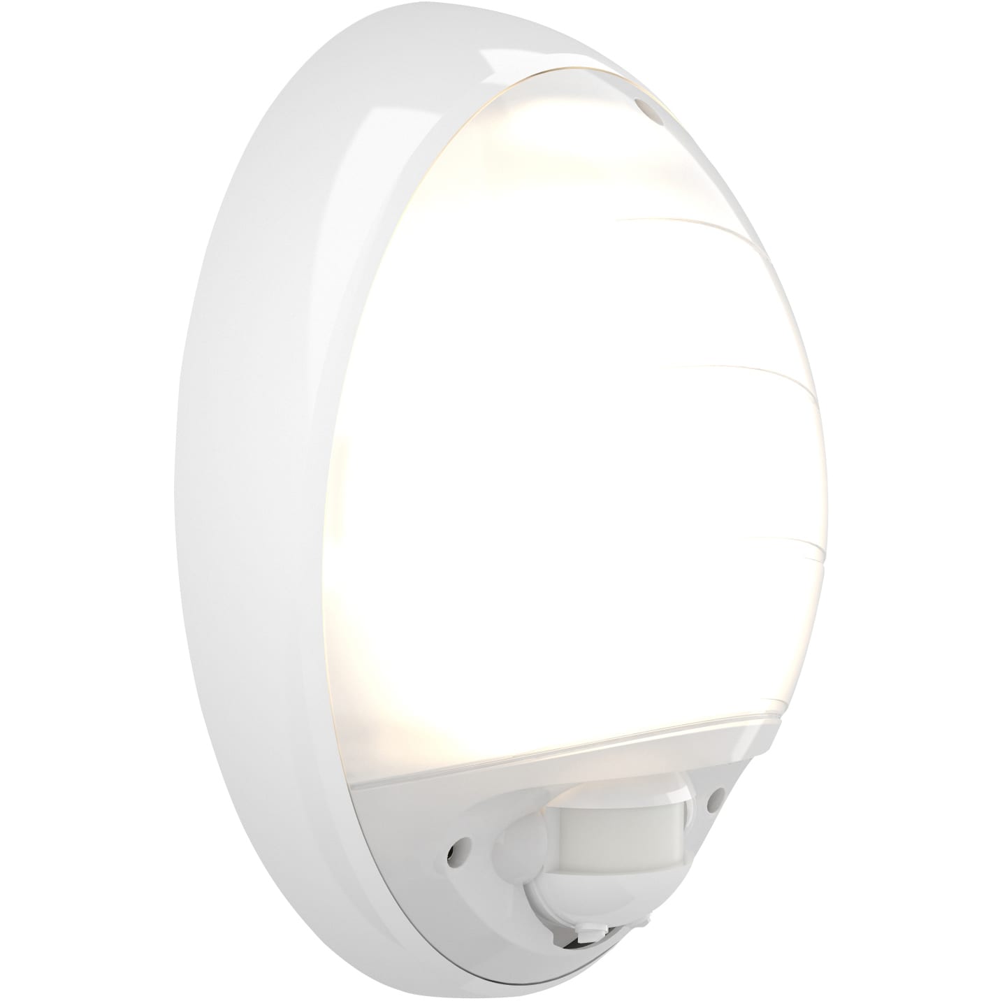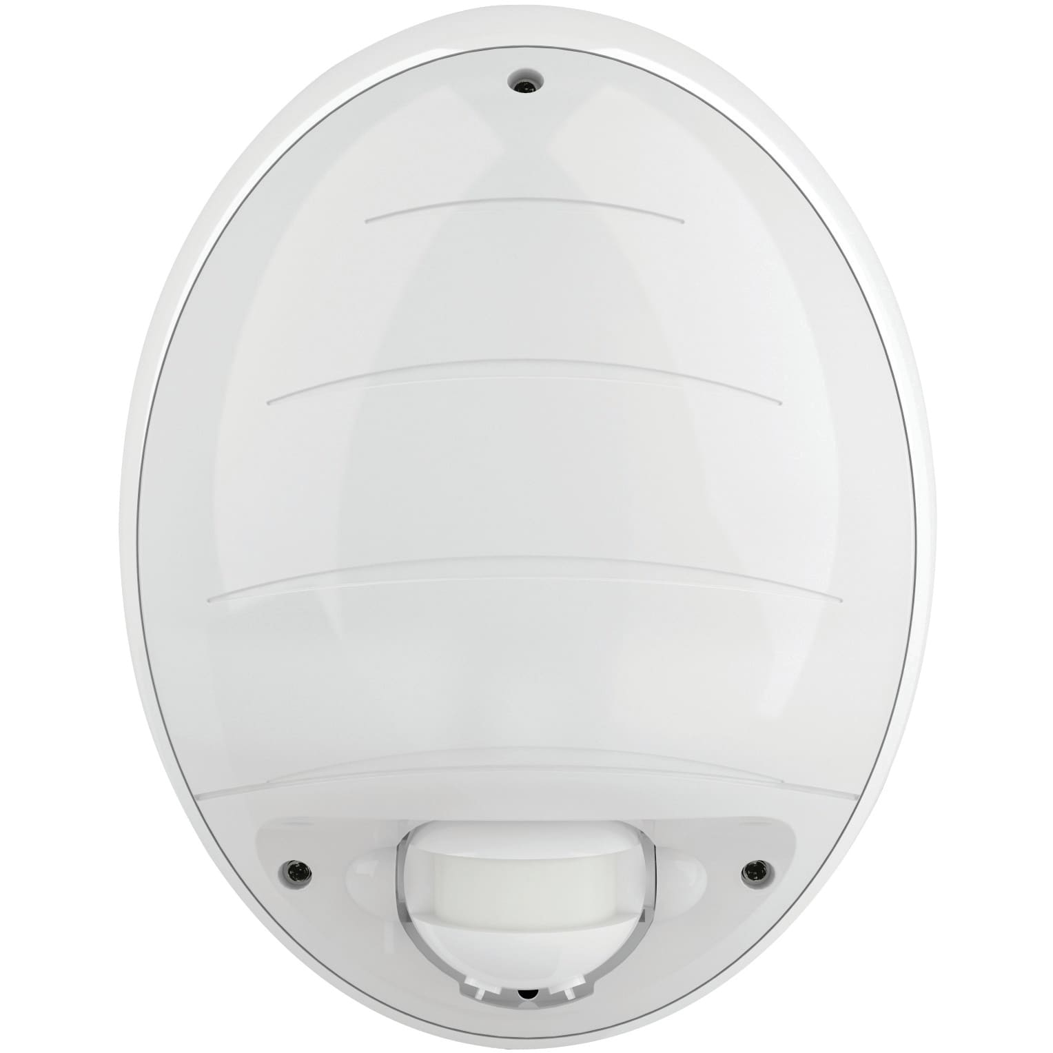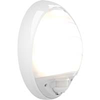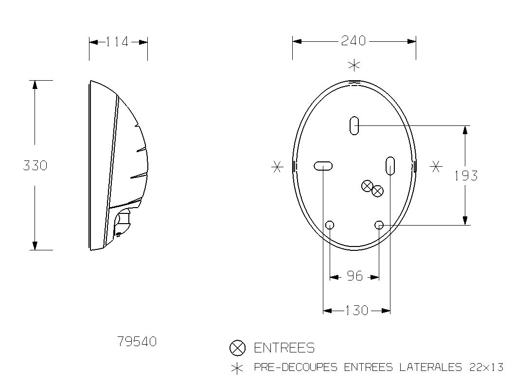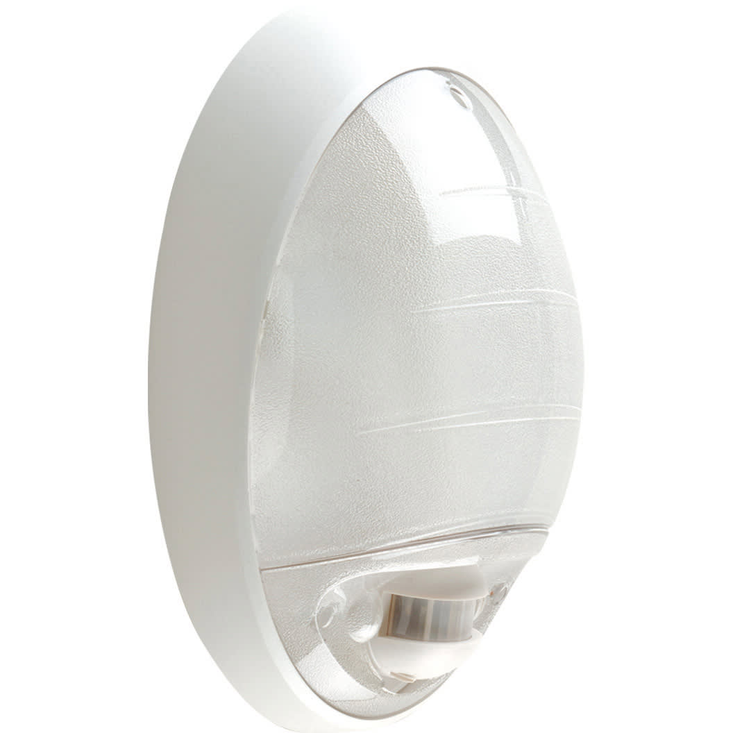 Applique murale fonctionnelle, ovale de dimensions 330x240mm – profondeur. 114mm Corps et bloc optique polycarbonate, avec 3 prédécoupes latérales pour arrivée possible en goulotte 22x13mm, Appareil équipé d’un détecteur de passage infrarouge de 10