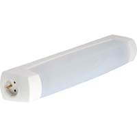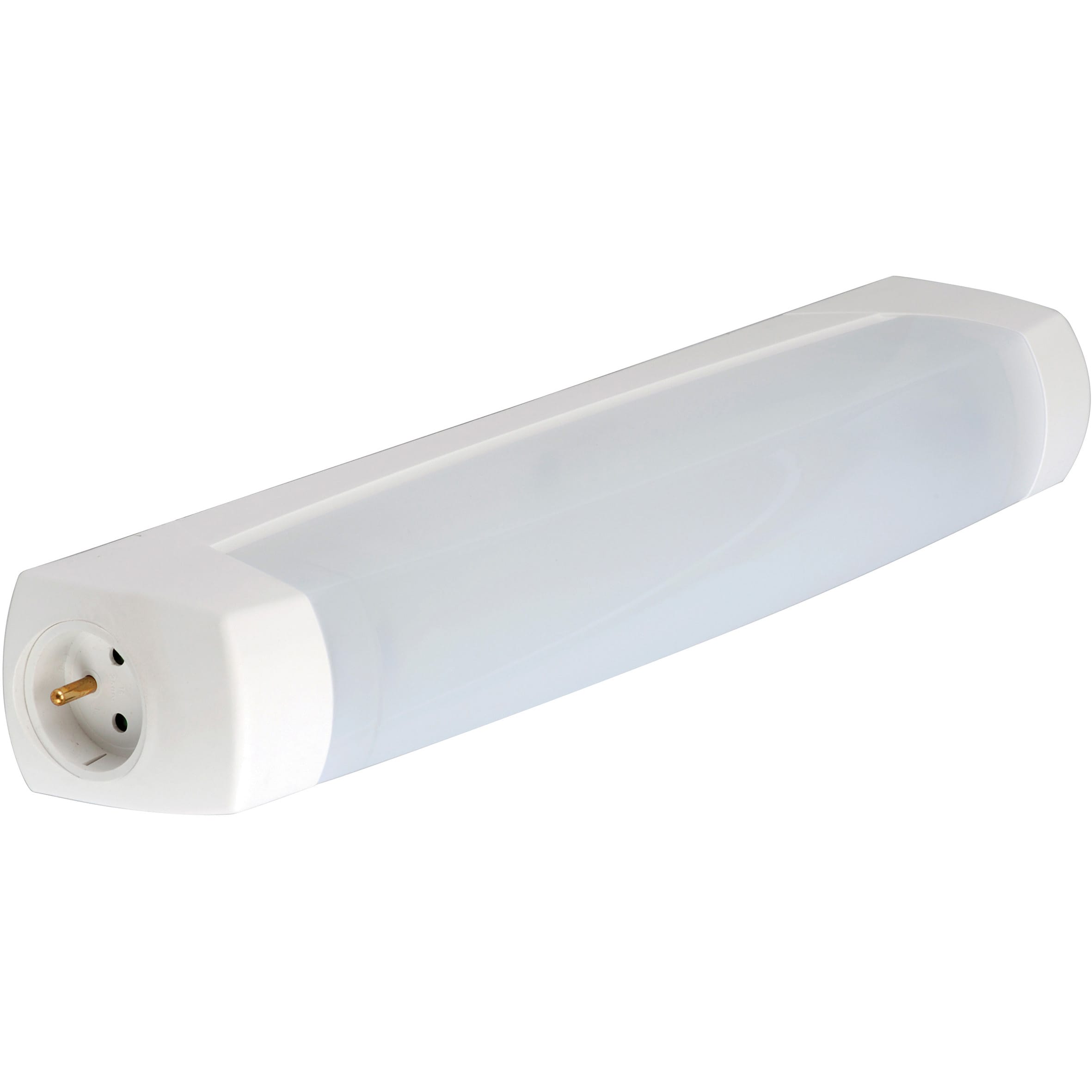 Réglette, longueur 445mm, largeur 64mm et profondeur 90mm. Embase polypropylène, diffuseur polycarbonate blanc. Version équipée d'une platine LED 7W. Sans interrupteur. Prise 16A 2P+T. Classe I.