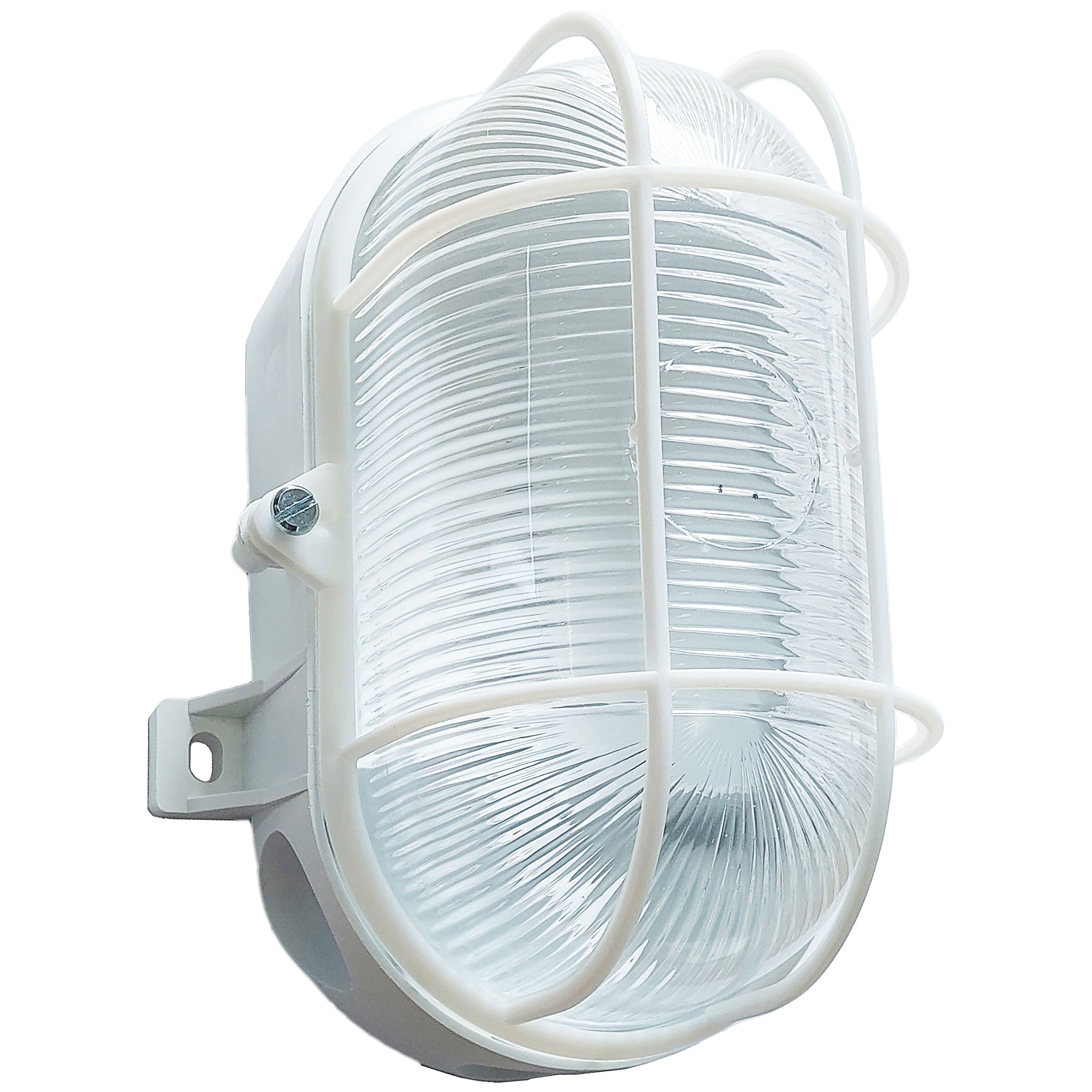 Applique fonctionnelle ovale avec pattes. Montage murale. Intérieur ou extérieur. Anneau et grille en polypropylène, diffuseur en verre. Montage facile : 2 points de fixation avec rattrapage de jeu. Livré sans lampe (douille E27).