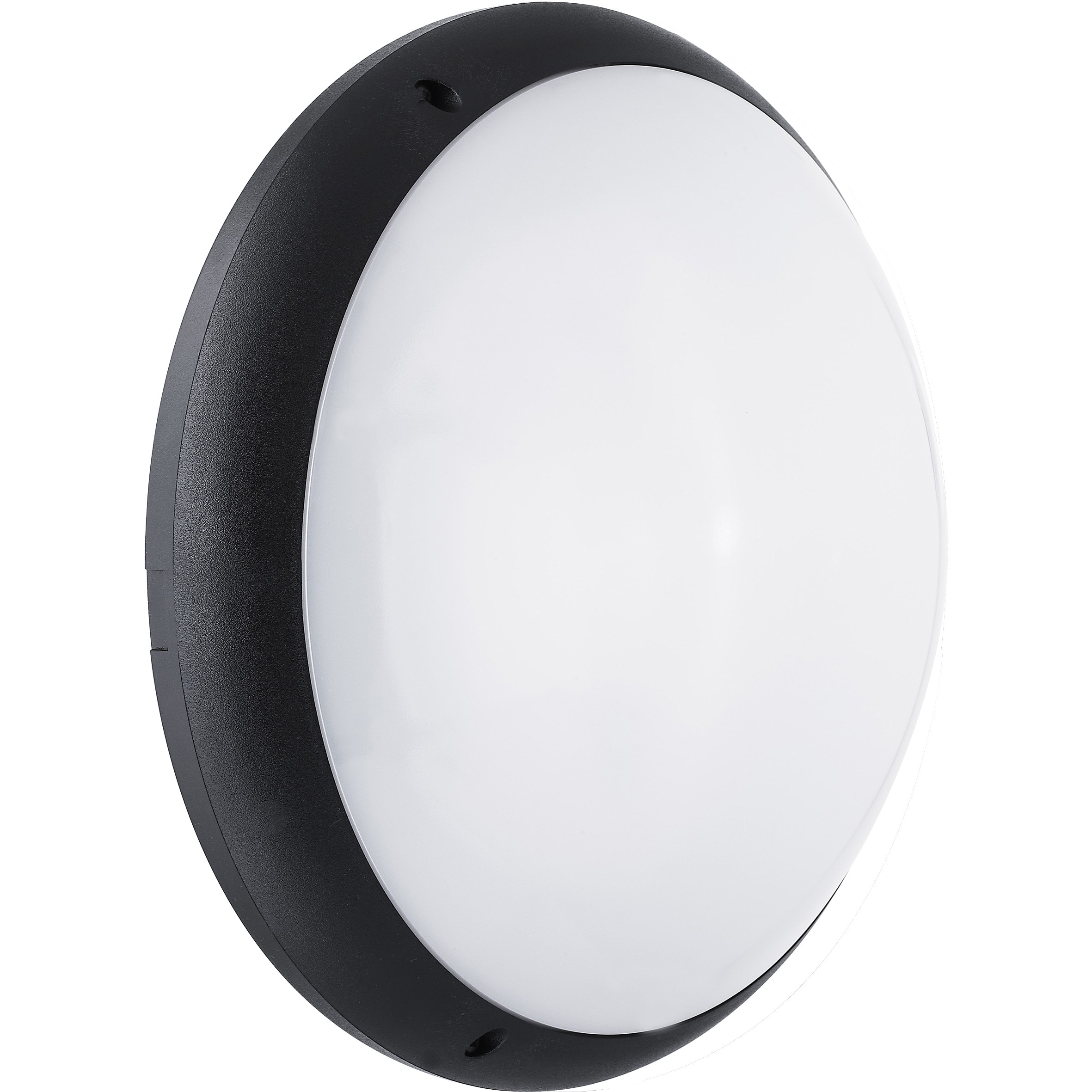 Hublot fonctionnel en deux parties: diffuseur solidaire de la colerette. Corps et diffuseur polycarbonate. Deux prédécoupes latérales pour goulotte 20x12,5mm. Solution antivandale: diffuseur fermé par 3 vis Torx. Equippé d'un détecteur hyperfréqu