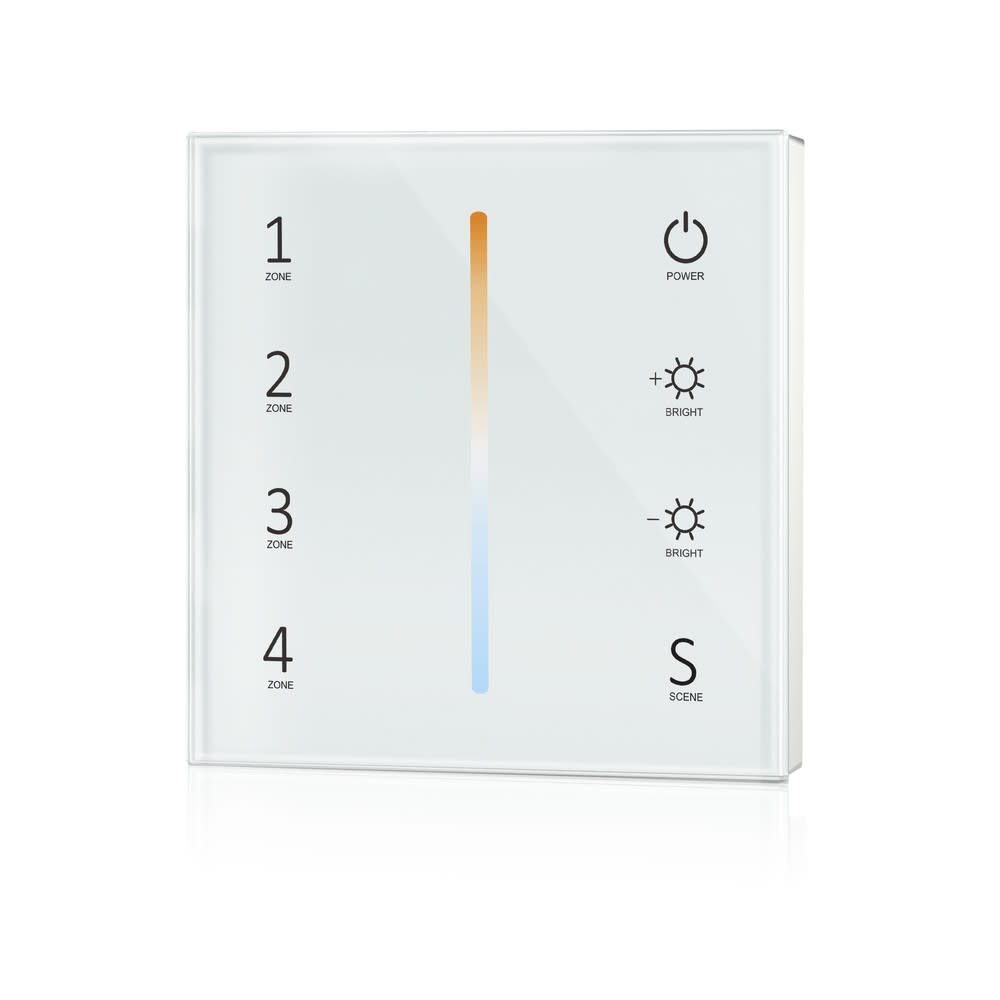 Ecran tactile radio fréquence. Caractéristiques du produit: Ecran tactile radio murale pour contrôler les rubans LED Tunable White. Signal de sortie : 2,4 GHz. Tension d'entrée : 100…240 V. Avantages du produit: Écran tactile en verre ultra-sensible haute résistance avec glissière tactile pour le choix de la température de couleur. Contrôle jusqu'à 4 zones. Gradation des couleurs. Interrupteur standard facilement remplaçable. Zones d'application: Éclairage général. Éclairage architectural. Éclairage dynamique comme un effet architectural dans les zones publiques. Éclairage de voûtes. Hôtels. Bureaux. Intérieurs résidentiels.