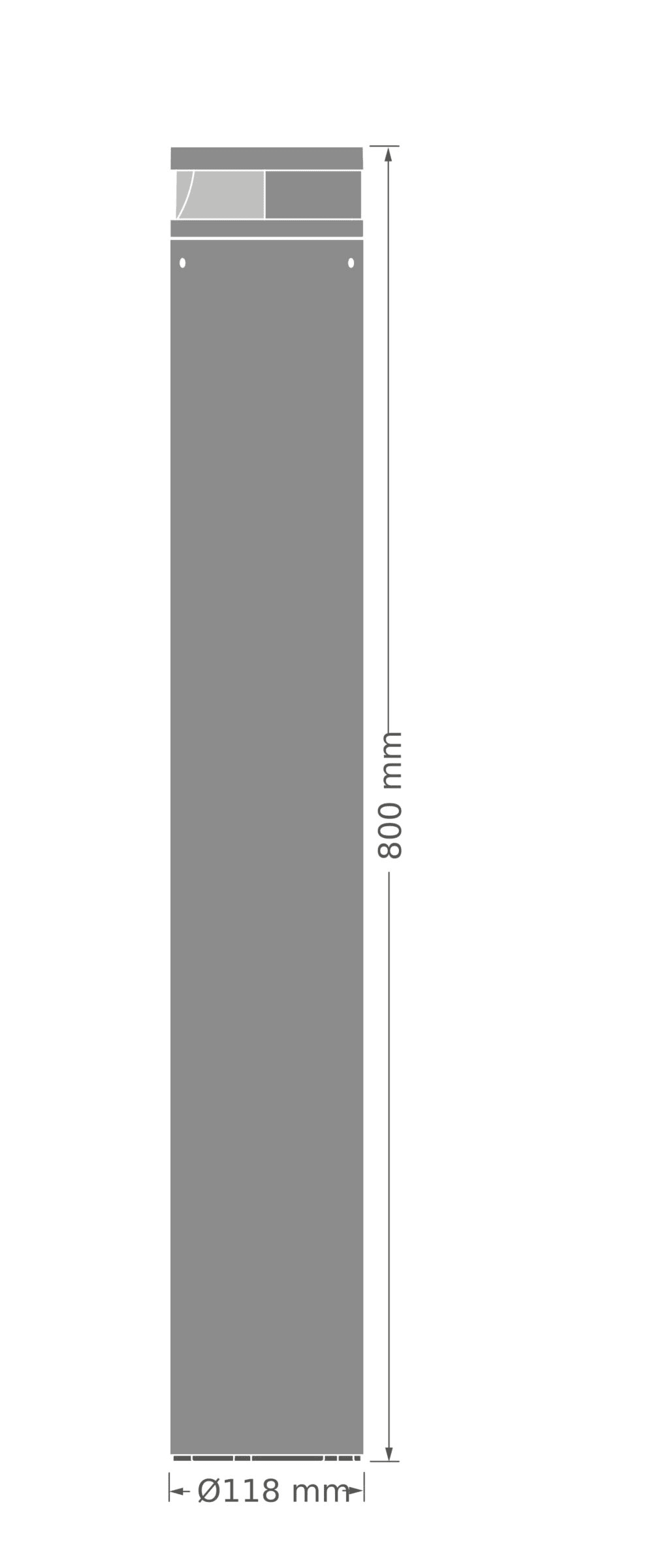 Borne LED en aluminium noir (RAL 9005) de classe I, diffuseur en PC clair. Performant : 80lm/W et 50 000h L80/B50. Optique asymétrique pour l'éclairage des cheminements. Température : -20…+45°C. Dimensions : ø118 x 800mm. Garantie : 5 ans.