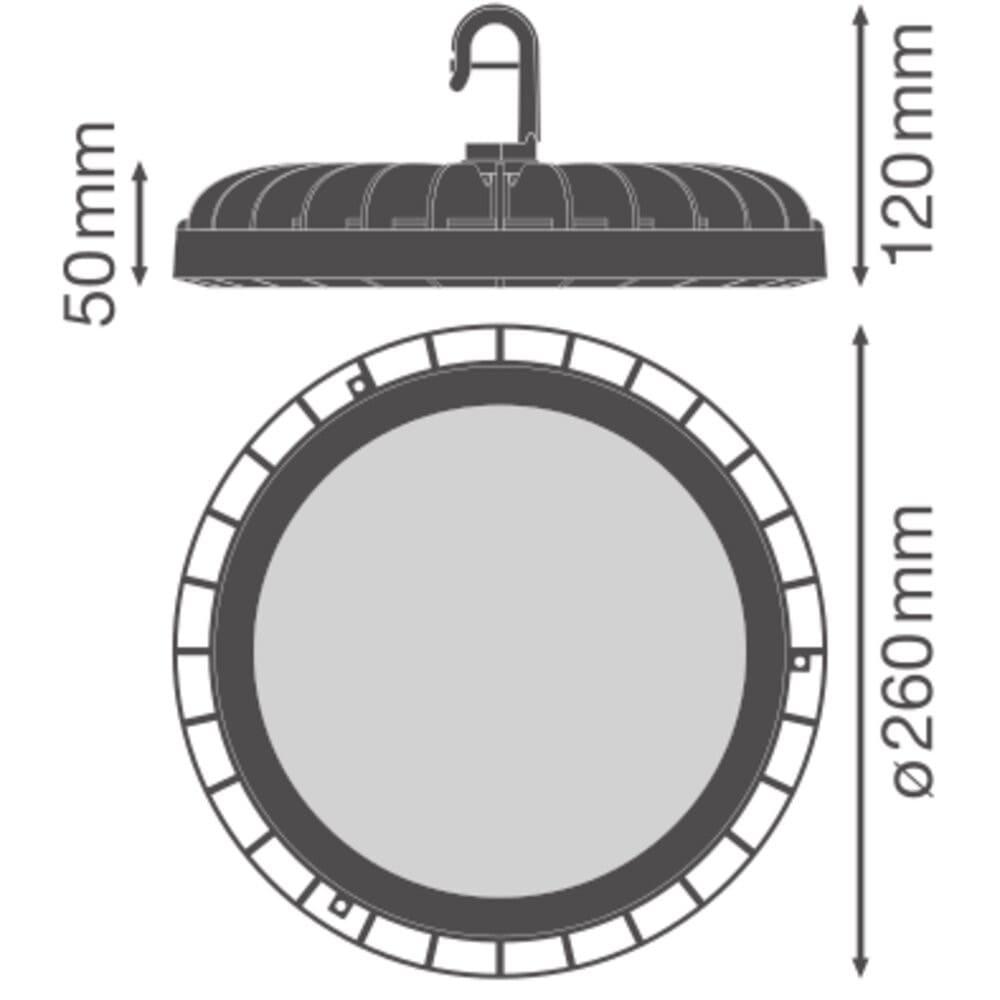 Luminaires High-Bay jusqu'à 165 lm/W. Caractéristiques du produit: Haute efficacité lumineuse : jusqu’à 165 lm/W. Boîtier en aluminium noir, couvercle en verre opale trempé. Multi Power et Multi lumen, puissance sélectionnable. Fonction multicolore : 4000 K, 5000 K et 6500 K. Durée de vie très longue (L70) : jusqu'à 100 000 h (à 25 °C). Température de fonctionnement : -20 à 50 °C. Grande homogénéité de couleur : ≤ sdcm. Type de protection : IP65. Avantages du produit: Design exclusif moderne. Économies d'énergie allant jusqu'à 60 % par rapport aux luminaires high bay conventionnels. Poids et dimensions optimisés grâce au design compact. Garantie de 5 ans. Zones d'application: Remplace les luminaires High Bay avec lampes mercure ou à décharge. Entrepôts. Halls de logistique. Industrie. Haut plafond (par exemple, dans les centres commerciaux, les aéroports, les immeubles commerciaux, les halls). Technique / Accessoires: Etrier disponible. Réflecteur disponible. Conseils de sécurité: Tous les branchements électriques doivent être effectués par une personne qualifiée.. Attention, risque de choc électrique.. Le câble ou cordon flexible externe de ce luminaire ne peut pas être remplacé ; si le cordon est endommagé, le luminaire doit être détruit.. Bornier non inclus. L'installation doit être effectuée par une personne qualifiée.. Afin de réduire le risque d'étranglement, le câblage flexible connecté à ce luminaire doit être fixé efficacement au mur si le câblage est à portée de main.. Produit de classe de protection I. Toutes les pièces métalliques conductrices d'électricité du boîtier qui peuvent absorber une tension pendant le fonctionnement ou pendant la maintenance en cas de défaut doivent être reliées en permanence au conducteur de protection..