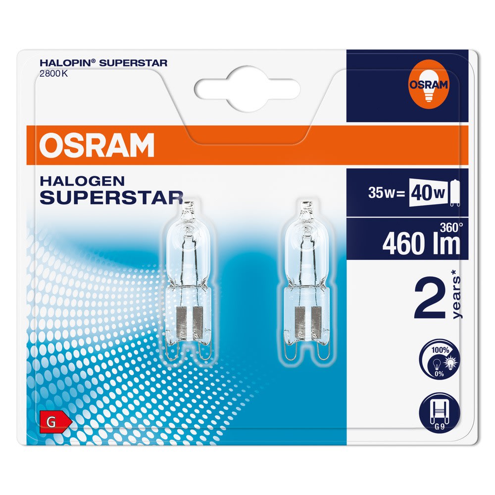 Lampes halogènes avec culot G9. Caractéristiques du produit: Durée de vie moyenne : 2 000 h. Gradable. Indice de rendu des couleurs Ra: 100. Culot : G9. Avantages du produit: Éclairage d'accentuation brillant. Dimensions extrêmement petites permettant une liberté dans la création de nouveaux luminaires. Design du filament robuste grâce à la technologie innovante et unique de pincement de la lampe. Homologué pour l'utilisation dans des luminaires ouverts (à IEC 60598-1). Manipulation simple grâce au culot G9/système de douille. Aucun transformateur nécessaire. Filtre UV. Conforme à IEC 60432-3 grâce à la fonction fusible intégrée. Zones d'application: Éclairage du lieu de travail. Éclairage pour la lecture. Conseils de sécurité: Ne touchez pas la lampe si elle est cassée.. Ne doit pas être utilisé si l'ampoule extérieure est défectueuse.. Lampe à utiliser uniquement dans un luminaire fermé..