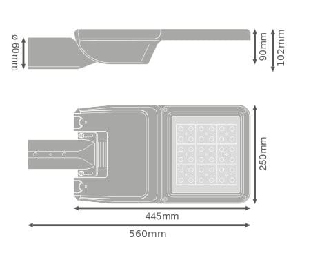 Luminaires pour l'éclairage public. Caractéristiques du produit: Température de couleur : 2 200 K, 2 700 K, 3 000 K, 4 000 K, 5 700 K. Distribution lumineuse optimisée pour les rues de largeur similaire à la hauteur du mât. Très longue durée de vie (L90/B10): jusqu'à 100 000 h (à 25 °C). Embout pour mâts de 48 à 60 mm inclus. Embout réglable pour un montage latérale et top. Réglage de l'angle d'inclinaison de +/- 15° sans ouverture du boîtier. Haute efficacité lumineuse : jusqu’à 180 lm/W. Température de fonctionnement : -40...50 °C. Protection contre les surtensions: jusqu'à 10 kV (L/N-PE). Classe de protection : I et II. Certificat : ENEC+, ENEC, ZD4i RoHS, SASO. Type de protection : IP66. Avantages du produit: Conception durable et sélection de composants de la plus haute qualité pour des performances durables. Câblage rapide et facile grâce à l'ouverture du boîtier sans outil et au bornier à bouton-poussoir. Grande uniformité de couleur. 5 températures de couleur disponibles, parfaitement adaptées pour éclairer des zones très diversifiés. Aucun flux lumineux au dessus de la ligne d'horizon (ULR 0%) lorsqu'il est monté à 0° d'inclinaison. Coupure du courant automatique à l'ouverture du boîtier. Garantie de 5 ans. Zones d'application: Éclairage urbain, éclairage de ville. Applications extérieures. Routes urbaines, routes industrielles, parkings. Classe M, C et P selon norme EN 13201. Zones piétonnes. Espaces publiques. Industrie. Conseils de sécurité: Tous les branchements électriques doivent être effectués par une personne qualifiée.. Attention, risque de choc électrique..