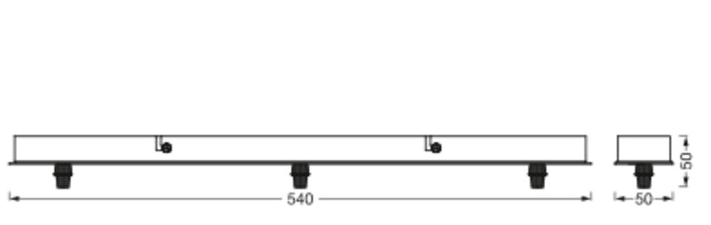 Patère retangulaire noire en aluminium pouvant accueillir jusqu'à 3 Pendulums 1906 de LEDVANCE. Classe I, 220-240V. Bornier à vis. Visserie pour le montage incluse. Dimensions (L x l x h) : 540 x 50 x 50 mm Garantie 5 ans