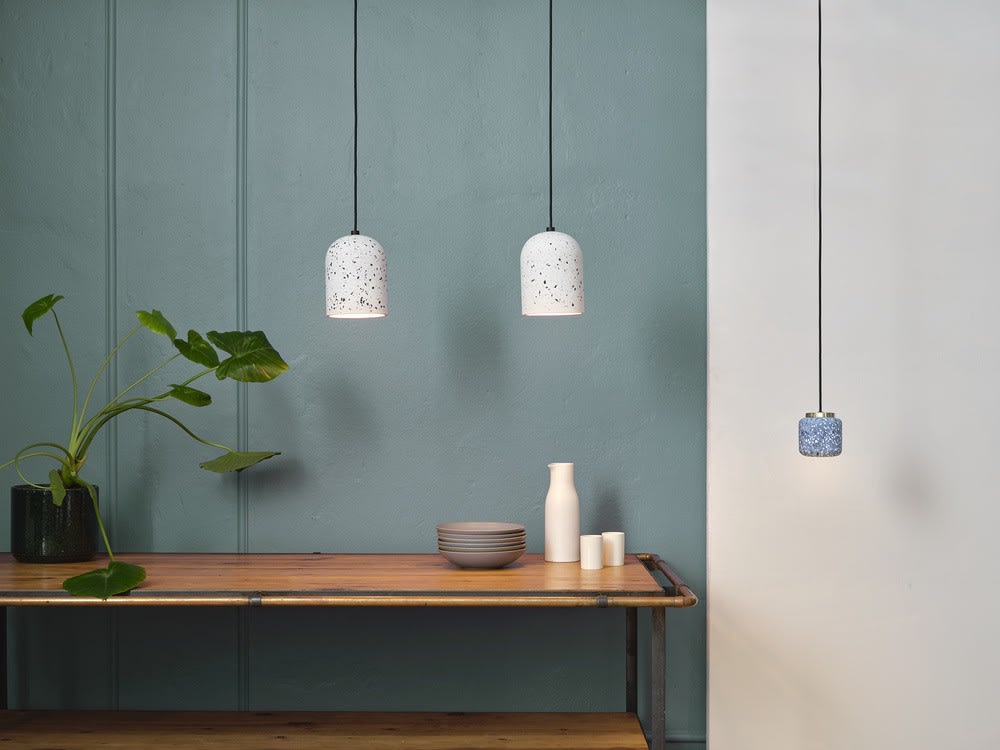 Suspension décorative en Terrazzo bleu. Classe II, 220-240V. Pour lampe LED de puissance maximale 5W. Bornier automatique dans patère. Visserie pour l'installation incluse. Dimensions (ø x h) : ø 100 x 1 500 mm. Garantie 5 ans.