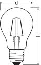 Lampes LED à intensité variable, forme classique. Caractéristiques produit: Lampes LED professionnelles pour tension secteur. Gradable (avec de nombreux gradateurs classiques, voir également ledvance.fr/dim). Ouverture du faisceau : jusqu'à 360°. Durée de vie : jusqu'à 15 000 h. Lampe en verre. Bonne qualité de la lumière ; indice de rendu des couleurs Ra: ≥ 80; chromaticité constante. Avantages produits: Lampes avec technologie de « filament » LED innovante. Très faible consommation d’énergie. Pas d'émission d'UV ni d'IR dans le faisceau lumineux. Allumage instantané. Peut remplacer facilement les lampes standard. Puissance thermique plus faible (par rapport au produit de référence standard). Conception, dimensions, flux lumineux comparables à une lampe halogène. Domaines d'application: Idéal pour les installations décoratives. Applications domestiques. Éclairage général. Utilisation en extérieur uniquement dans des luminaires d'extérieur appropriés.