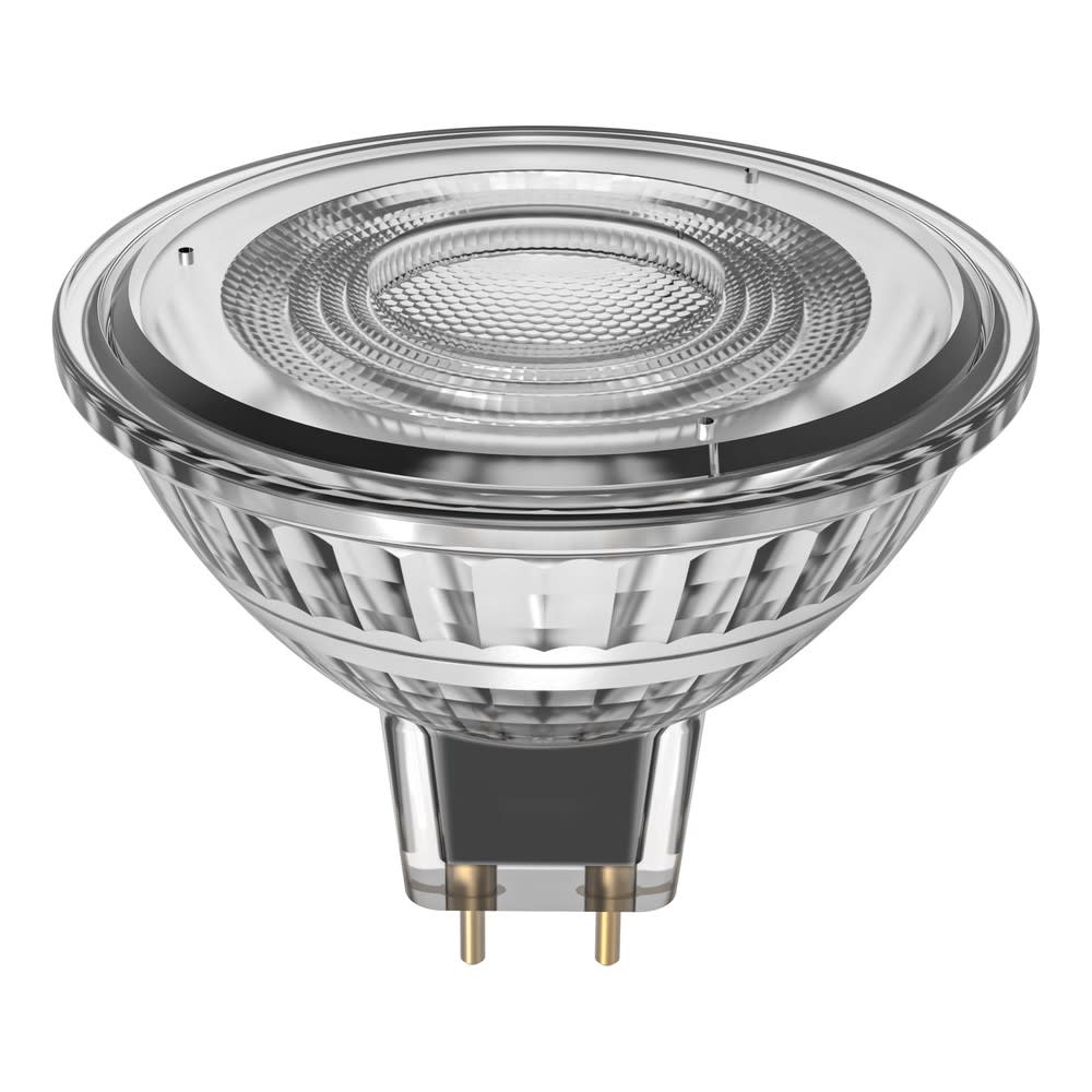 Lampes LED à réflecteur MR16, très basse tension, gradables, culot à broches. Caractéristiques du produit: Alternative LED aux lampes halogènes basse tension. Stabilité de la teinte : ≤ 3 SDCM. Gradable. Culot : GU5.3. Lampe en verre. Excellent rendu des couleurs (Ra: 97). Durée de vie : jusqu'à 40 000 h. Avantages du produit: Remplacement rapide, simple et sûr sans recâblage. Conception, dimensions, flux lumineux comparables à une lampe à incandescence classique ou halogène. Faibles coûts de maintenance et économies de coûts grâce à une longue durée de vie. Pas d'émission d'UV ni d'IR dans le faisceau lumineux. Gradation en continu. Compatible avec de nombreux variateurs, voir www.ledvance.fr/dim. Compatible avec de nombreuses alimentations électroniques et conventionnelles standard (voir aussi liste de compatibilité). Allumage instantané. Consommation d'énergie inférieure à celle des lampes à incandescence ou halogènes. Zones d'application: Commerces et salles d'exposition. Applications domestiques. Applications commerciales. Éclairage d'accentuation. Utilisation en extérieur uniquement dans des luminaires d'extérieur appropriés. Conseils de sécurité: Ne touchez pas la lampe si elle est cassée.. Ne doit pas être utilisé si l'ampoule extérieure est défectueuse..