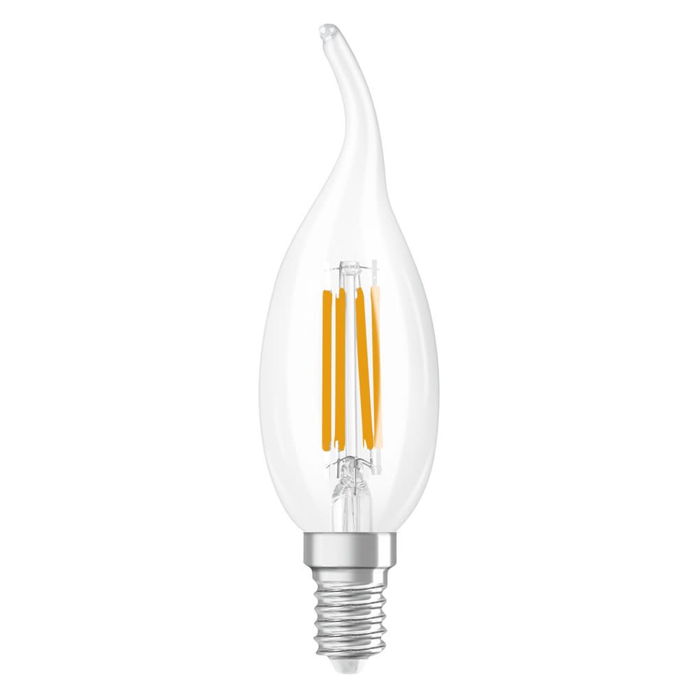Lampes LED gradables, forme classique de mini-bougie avec pointe incurvée. Caractéristiques du produit: Lampes LED disponibles pour tension secteur. Gradable (avec de nombreux gradateurs classiques, voir également www.ledvance.fr/dim). Durée de vie jusqu'à 15 000 h. Lampe en verre. Bonne qualité de la lumière ; indice de rendu des couleurs Ra: ≥ 80; chromaticité constante. Avantages du produit: Lampes avec technologie de « filament » LED innovante. Consommation d'énergie inférieure à celle des lampes à incandescence ou halogènes. Allumage instantané. Peut remplacer facilement les lampes standard. Design, dimensions, flux lumineux comparables à une lampe à incandescence. Zones d'application: Idéal pour les installations décoratives. Applications domestiques. Éclairage général. Utilisation en extérieur uniquement dans des luminaires d'extérieur appropriés. Conseils de sécurité: Ne touchez pas la lampe si elle est cassée.. Ne doit pas être utilisé si l'ampoule extérieure est défectueuse..