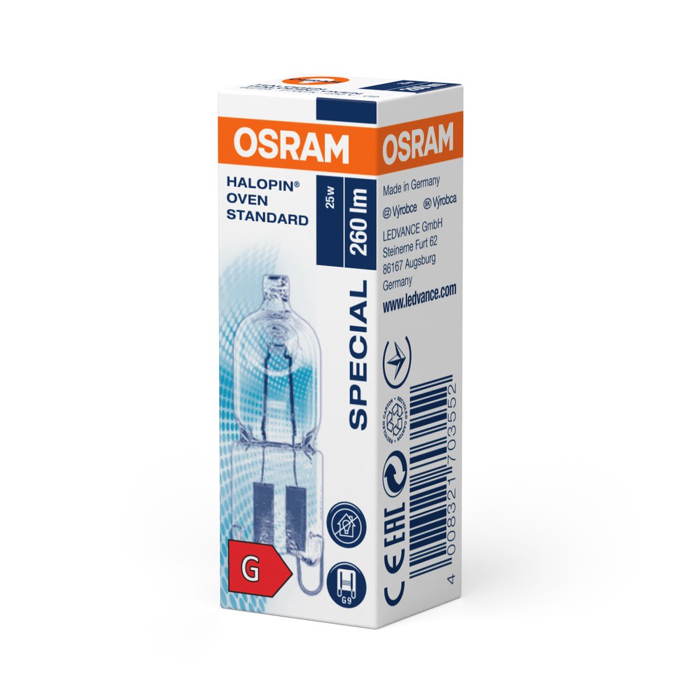 Lampes halogènes, spécial four. Caractéristiques du produit: Durée de vie moyenne : 2 000 h. Avantages du produit: Contenu halogène optimal pour des températures élevées. Ne contient pas de mercure. Zones d'application: Fours de cuisson. Conseils de sécurité: Ne touchez pas la lampe si elle est cassée.. Ne doit pas être utilisé si l'ampoule extérieure est défectueuse.. Lampe à utiliser uniquement dans un luminaire fermé.. Non conçu pour remplacer l'éclairage conventionnel dans un foyer privé..