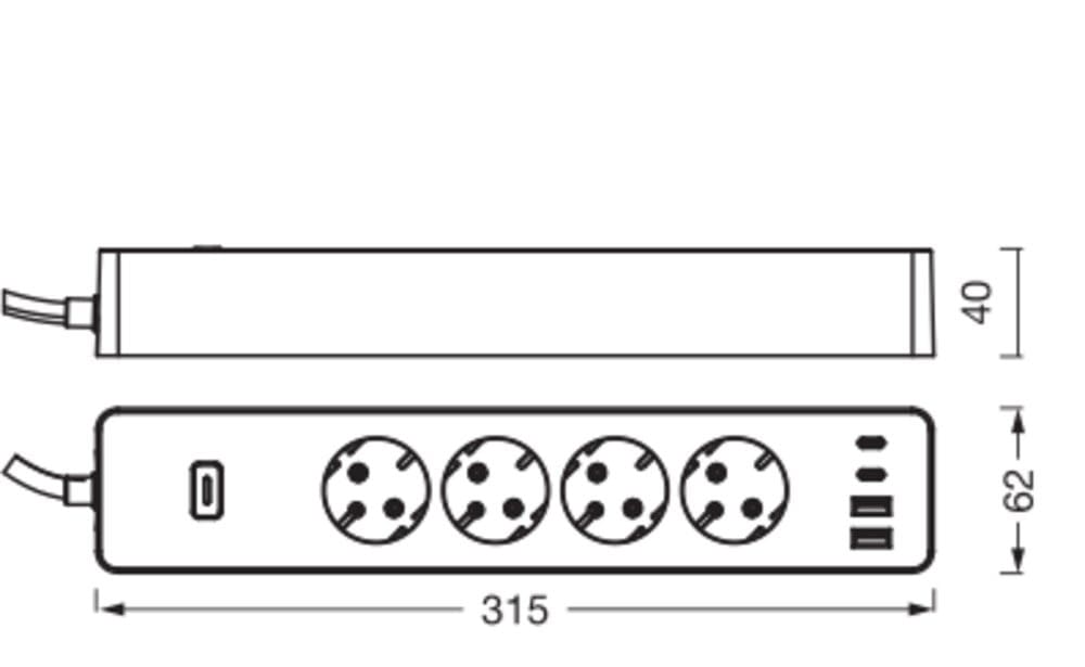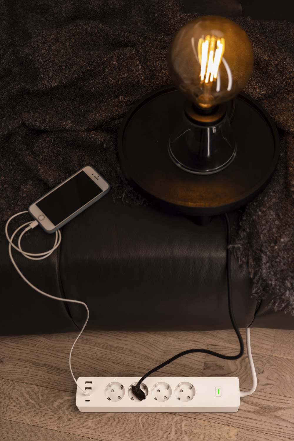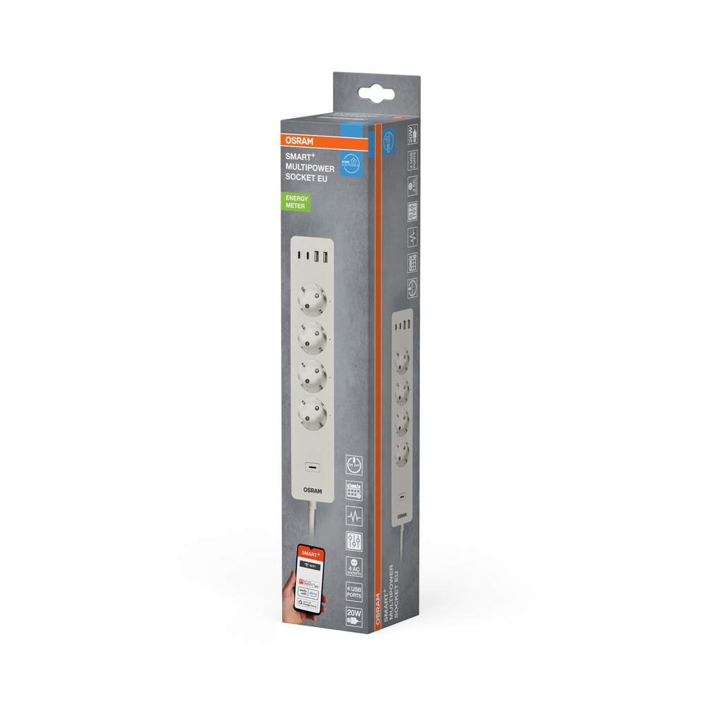 Multi Power Socket with smart 4 EU sockets and USB ports with WiFi technology. Caractéristiques du produit: 4 prises standard intelligentes et 4 ports USB intelligents pour la charge (2 ports chacun de type A et C). Chargeur USB : Charge rapide avec USB Power Delivery (USB PD) jusqu'à 20W de puissance. Les prises de courant peuvent être contrôlées individuellement et les ports USB sont contrôlés en un seul groupe. Haut pouvoir de coupure : jusqu'à 3 680 W / 16 A. Compteur d'énergie. Planification. Câble d'alimentation de 1,5 m pour une installation flexible. Protocole réseau : Wi-Fi (2,4 GHz). Controllable via SMART+ App (with minimum Android 8.0 or iOS 14.0). Contrôlable via enceinte vocale : Google Assistant ou Amazon Alexa. Controllable via SMART+ WiFi Remote Controller. Avantages du produit: Multiprise connectée : pour connecter en toute simplicité des appareils électriques conventionnels via les prises ou les ports USB. Surveille la consommation d'énergie des appareils connectés et suit la consommation d'énergie. Intègre l'équipement électrique conventionnel dans les systèmes domestiques intelligents compatibles. Permet la commutation de sources lumineuses conventionnelles et d'autres appareils électriques. Contrôle sans fil via l'application ou la commande vocale. Zones d'application: Partout où les appareils non intelligents doivent être intégrés dans des systèmes domestiques intelligents compatibles. Ports USB disponibles pour l'alimentation. Conseils de sécurité: Débrancher les appareils qui génèrent de la chaleur sur secteur, comme la multiprise SMART+, après utilisation pour éviter qu'il s'allument accidentallement.. Very high capacitive and inductive loads may in some cases lead to destruction of the device or reduction in the number of switching cycles.. Ne pas utiliser la multiprise SMART+ avec un équipement médical.. À raccorder à un disjoncteur automatique (pour max. 16 A). Produit de classe de protection I. Toutes les pièces métalliques conductrices d'électricité du boîtier qui peuvent absorber une tension pendant le fonctionnement ou pendant la maintenance en cas de défaut doivent être reliées en permanence au conducteur de protection..