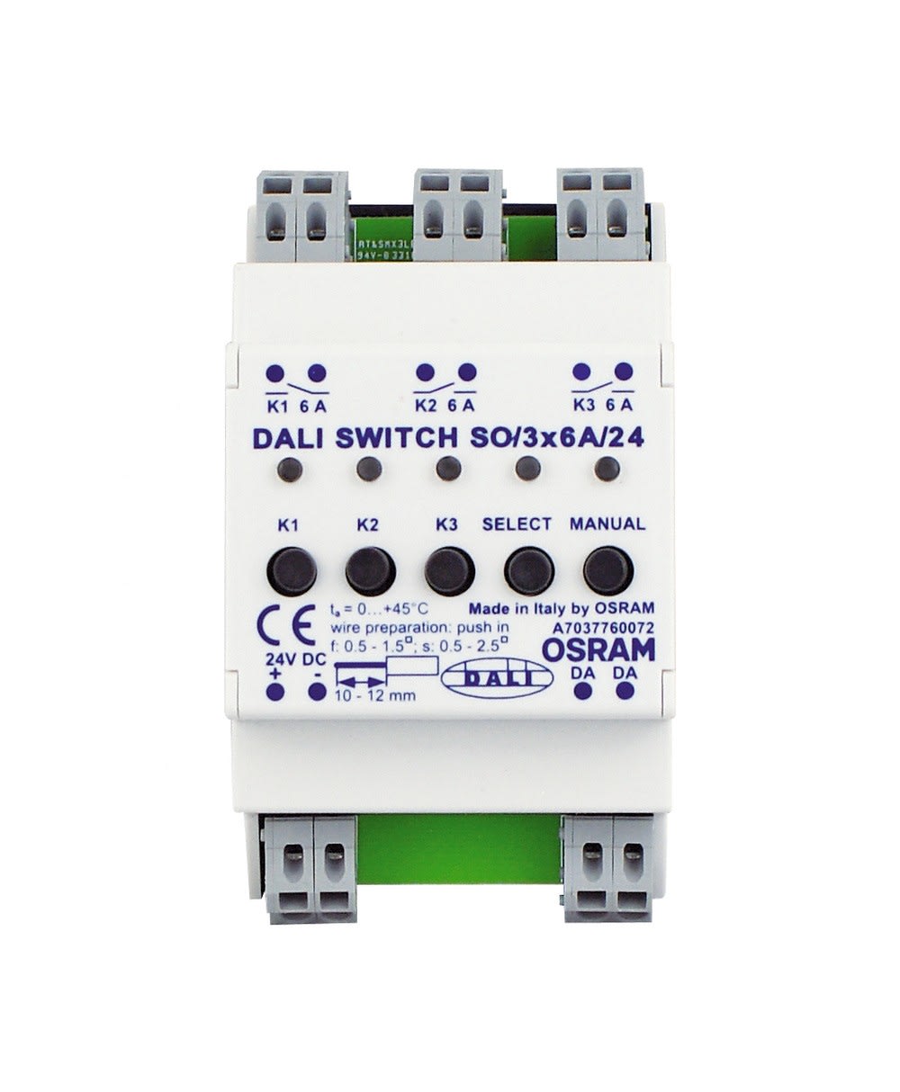 Convertisseurs de signal pour système de gestion de l'éclairage. Caractéristiques du produit: Sortie de commutation commandée par DALI pour lampes non gradables, ballasts QT, OT, PT, HT. 3 contacts de relais indépendants. Charge admissible : 6 A charge ohmique. Tension d'alimentation : 24 V CC. Contacts sans potentiel. Avantages du produit: Adressage possible via DALI. Zones d'application: Industrie. Convient pour une utilisation en combinaison avec tout ballast POWERTRONIC ®. Rénovation de bâtiments historiques. Technique / Accessoires: Peut être utilisé avec tous les boîtiers de commande DALI. Alimentation 24 V nécessaire (p. ex. PS 30).