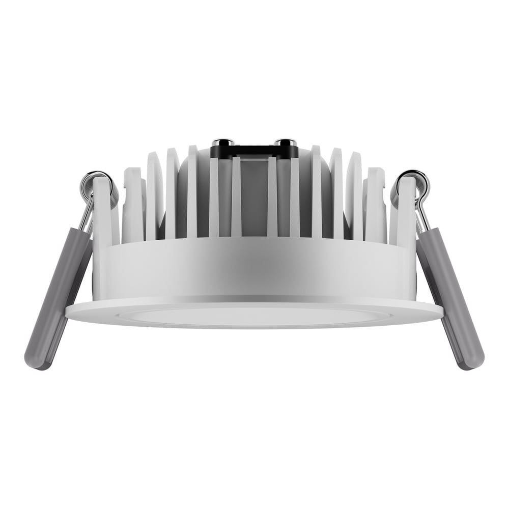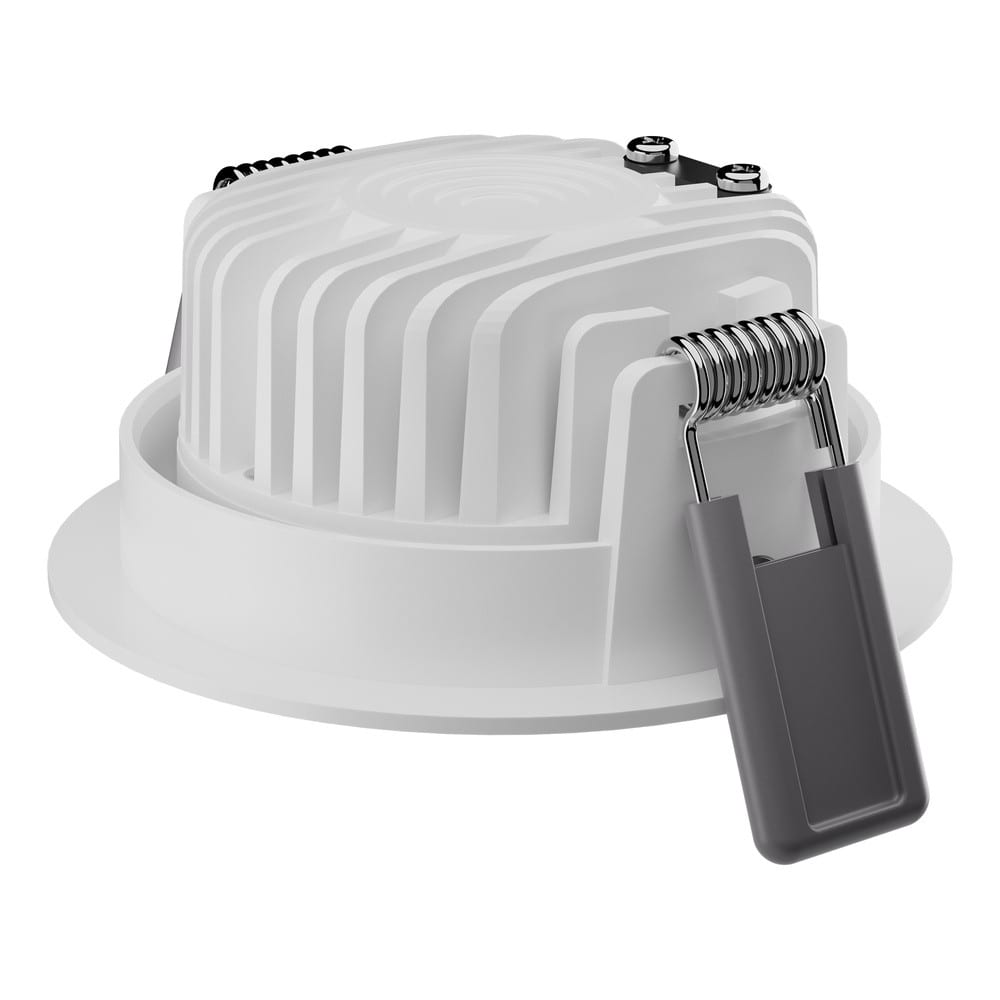 Corps en aluminium, colerette blanche. Classe II, 3000K, 85lm/W, sélection de puissance (4W/6W/8W) par interrupteur, 50 000h L70. Orientable ±25°, IRC>90, SDCM?3, gradable (TRIAC). Découpe Ø83mm, Dim (Øxh): Ø90x38,5mm. Garantie 5 ans.