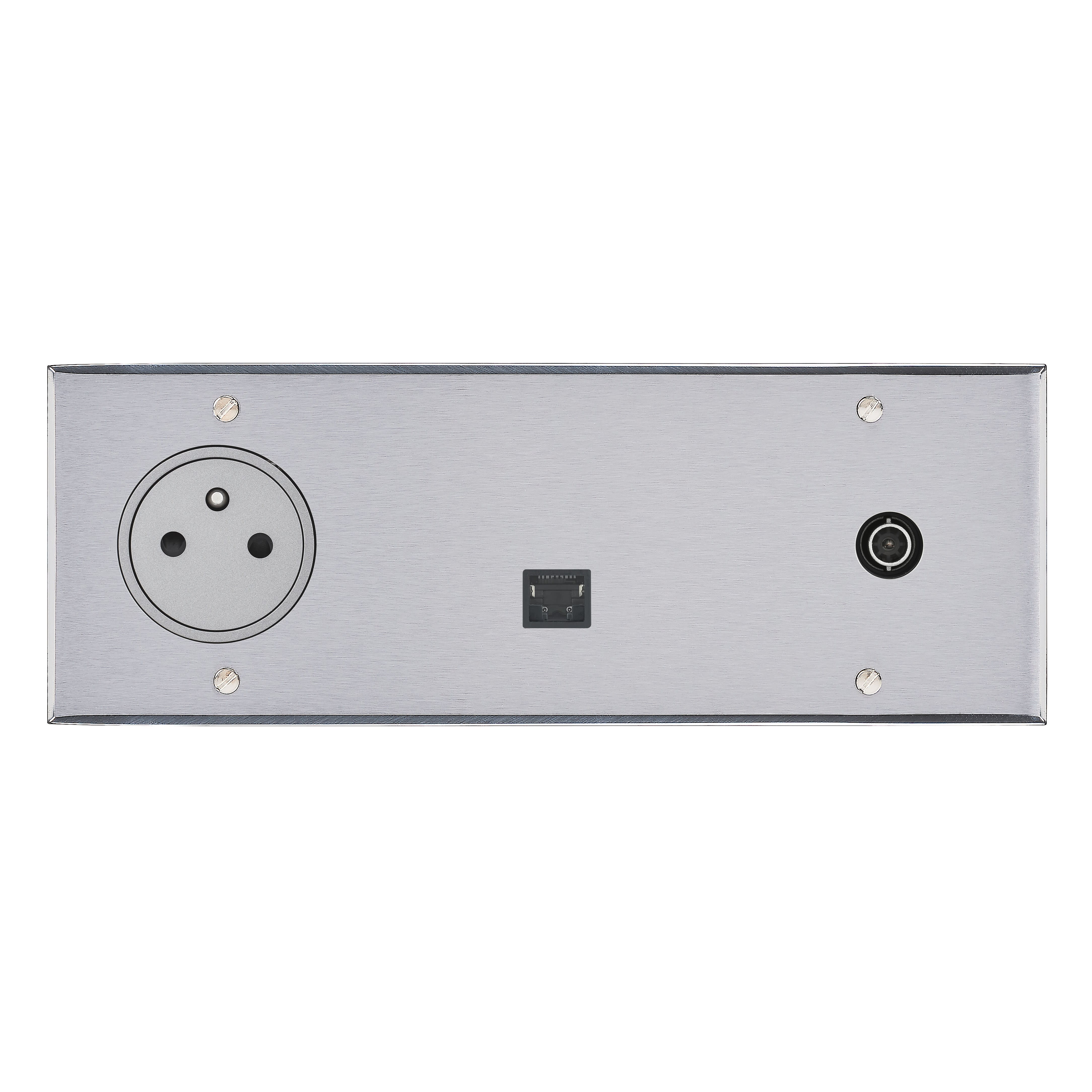 Prise de courant 2P+T Surface gris magnésium 16A 250V avec prise multimédia RJ45 catégorie 6 FTP et prise télévision simple Art d'Arnould univers Mémoire finition Acier brossé monobloc format 3 postes