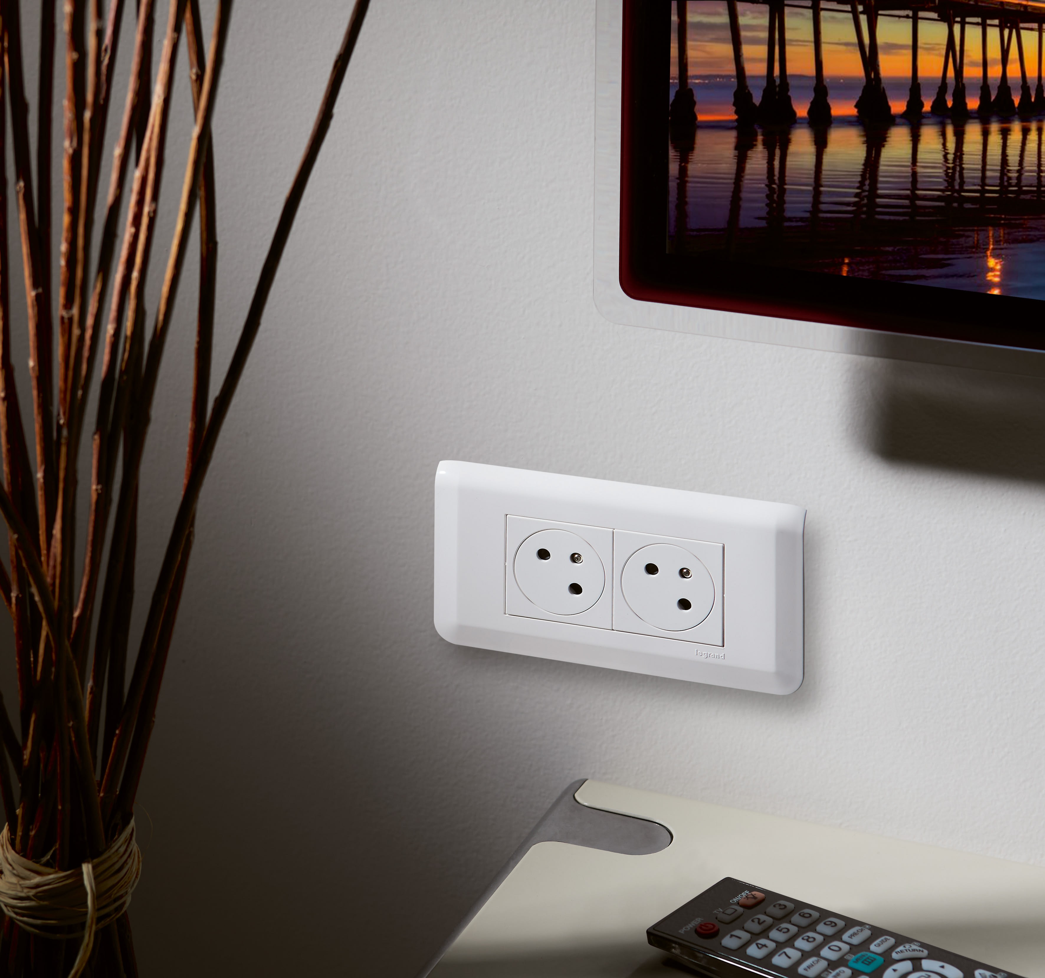 Standard franco-belge, 16A, 230V Résistance aux chocs renforcée : indice IK07 Connexion par Bornes automatiques à levier permettant la connexion rapide sans outil Blanc RAL9003 Finition brillante