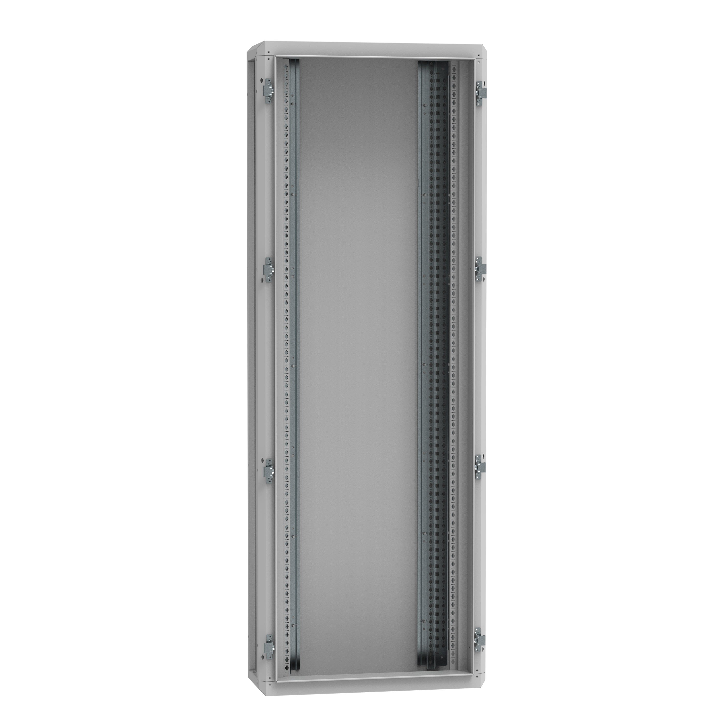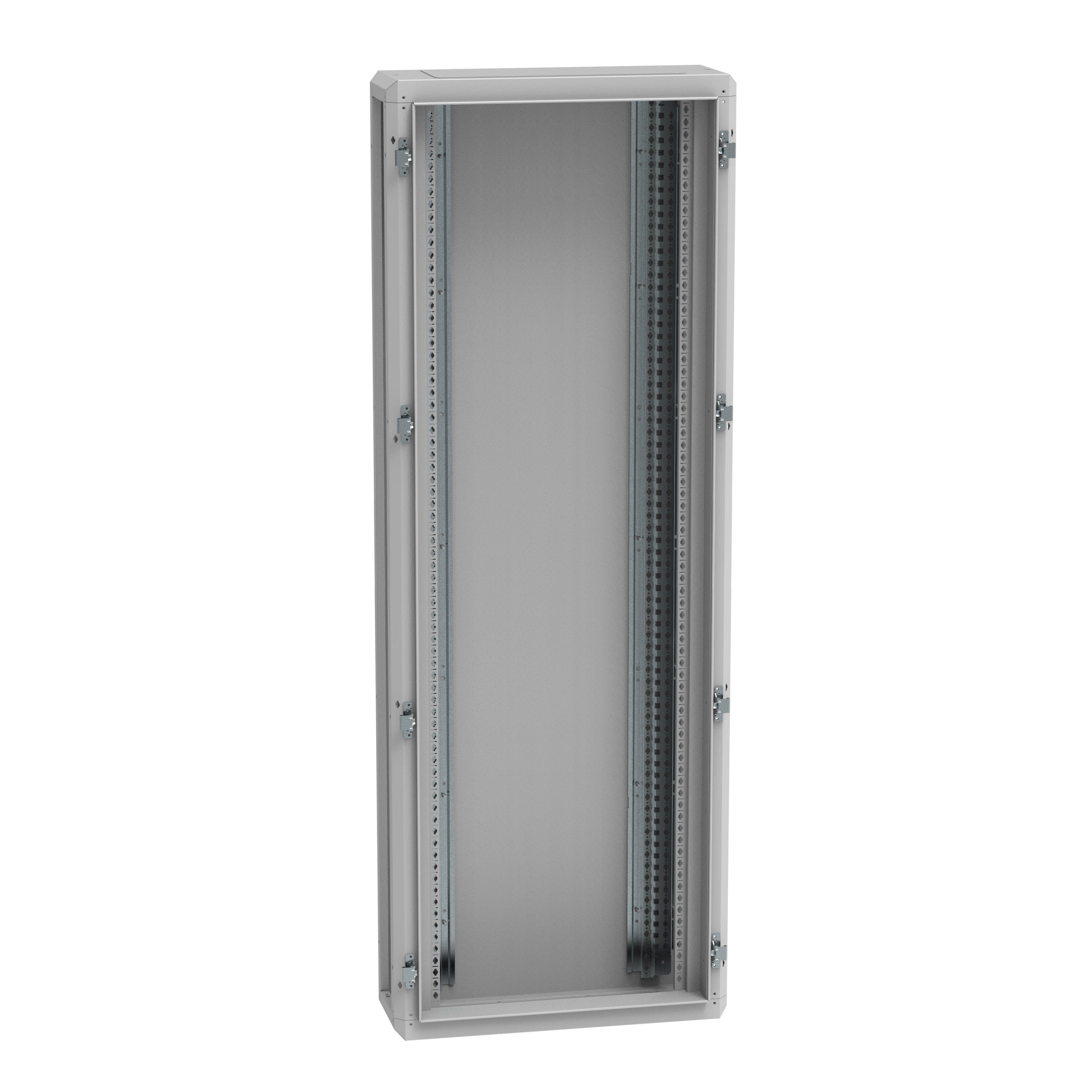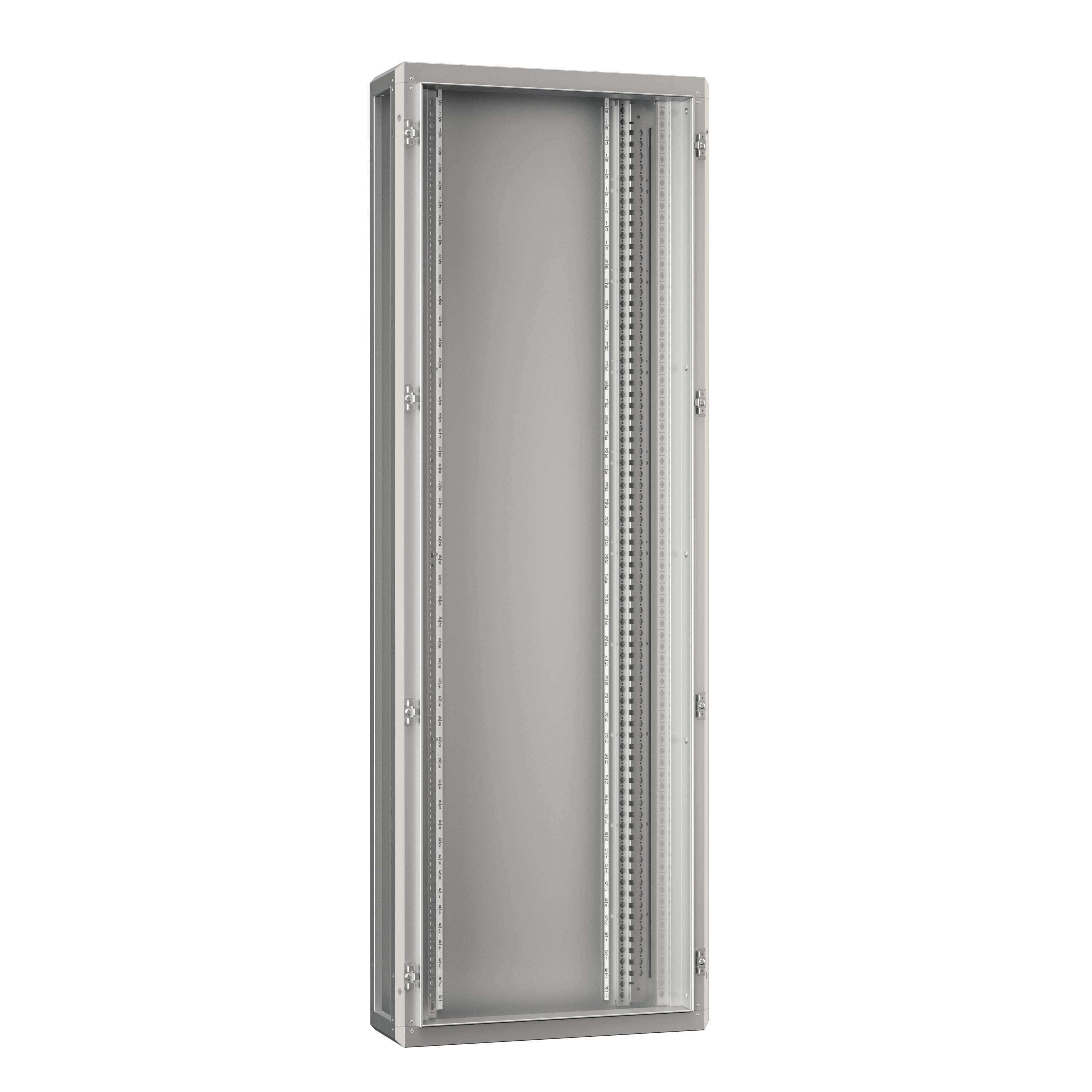 Dimensions extérieures : hauteur 2046mm - largeur 706mm - profondeur 252mm IP55 - IK08 avec porte Structure soudée et montants fonctionnels vissés à l'arrière de l'armoire pour une plus grande rigidité Panneaux à commander séparément Revêtement époxy polyester RAL7035