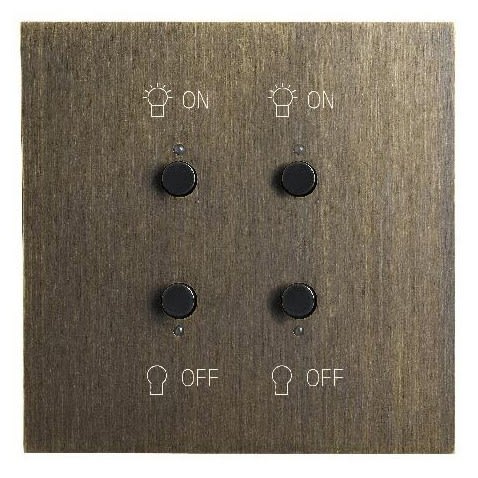 Interrupteur double ON/OFF pour lumière MyHOME_Up Art d'Arnould avec 4 poussoirs et 4 LEDs de statut Univers Epure Bronze Boutons noirs Dimensions grand carrée 80x80mm